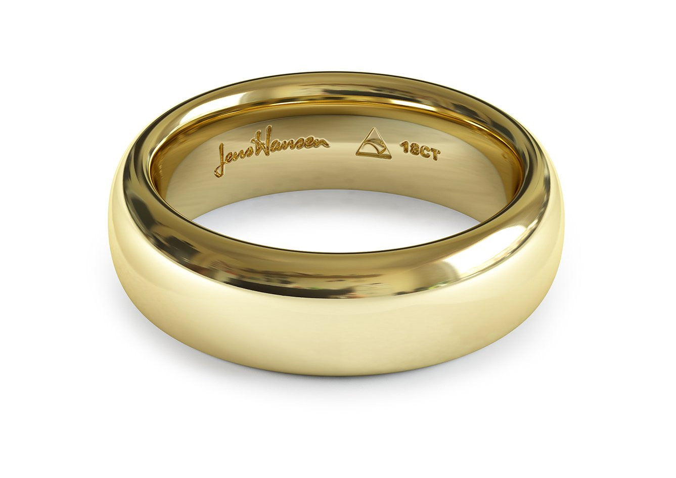 The Jens Hansen Ring that was filmed for The Lord of the Rings™ movies was originally made in 18ct yellow gold. It weighed approximately 17 grams (more than 1/2 oz.), is 2.7mm thick through the band and measures about 7mm tall (just over 1/4 inch) when laid on its side.