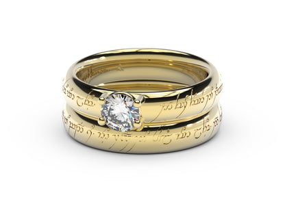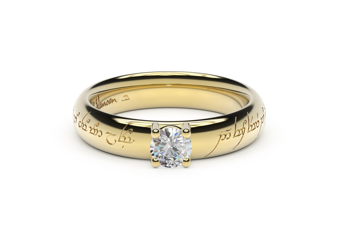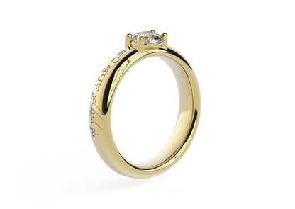 Elegant contemporary styling, fashioned in Yellow Gold, this ring features a four prong setting that showcases the brilliance of the diamond. The band has the same unique shape as our Famous replica Ring and is Engraved with our Elvish Love Poem putting this design a step above the ordinary.
