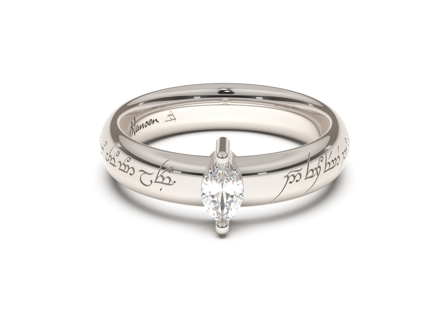 This Elvish Love Ring is a recreation of the “Movie Ring” that played the role of the “One Ring” in the “Lord of the Rings” movie trilogy by Peter Jackson.The design is based on how one of Jens’ sons, Thorkild, described the ring as a child:“Simple, heavy band.”Since the first movie premiered in December 2001, the Movie Ring has been the most recognizable ring in the world.