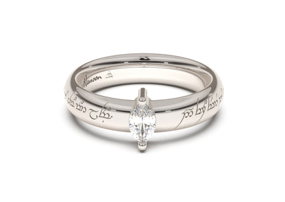 The engraving is often what truly gives a ring its meaning. You can choose your own Elvish (or any other language) engraving for both inside and outside the ring.The Elvish Love Poem fits perfectly on the outside of the ring:One ring to show our love,One ring to bind us,One ring to seal our love,And forever to entwine us.