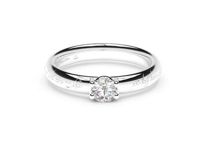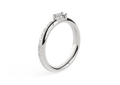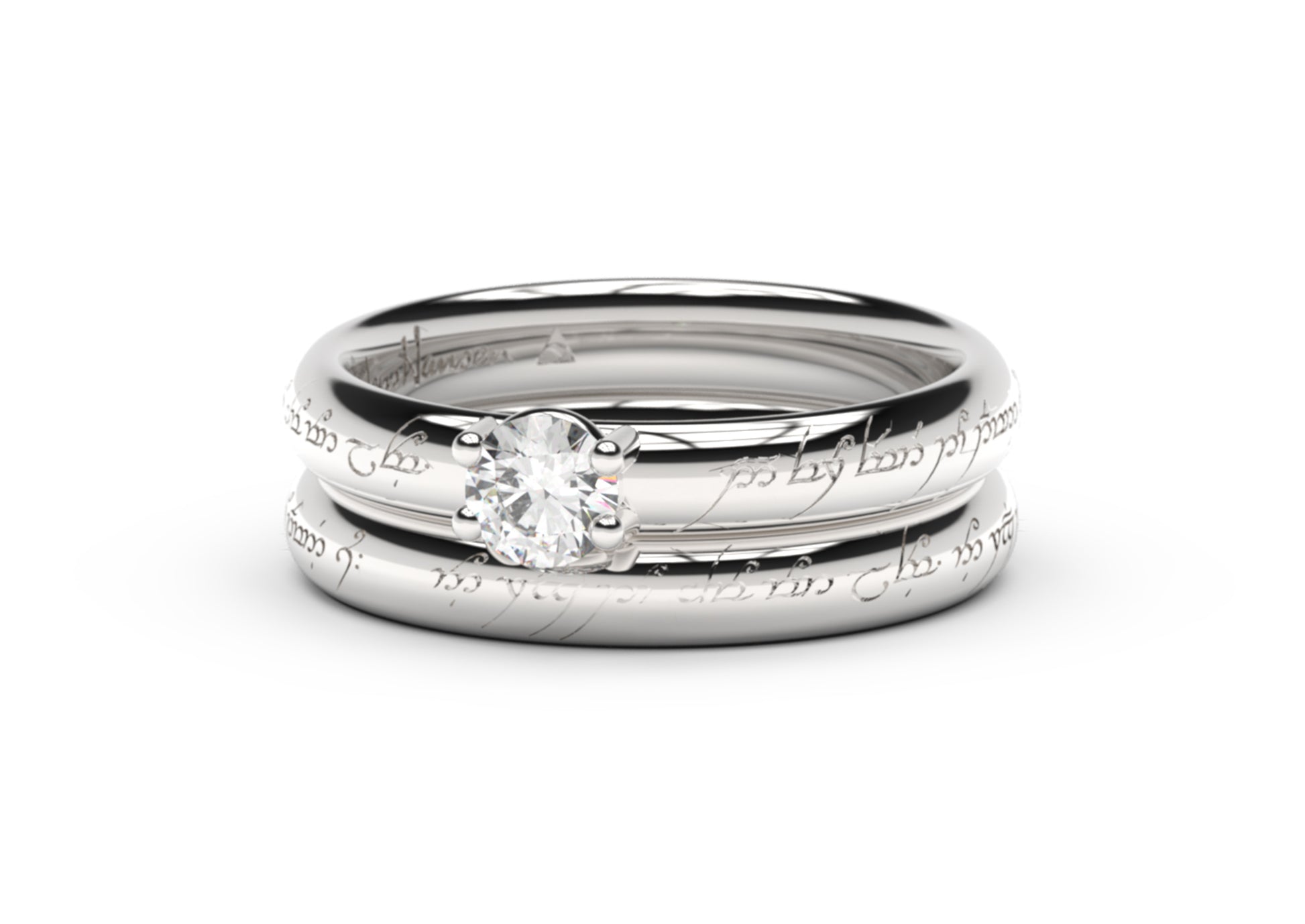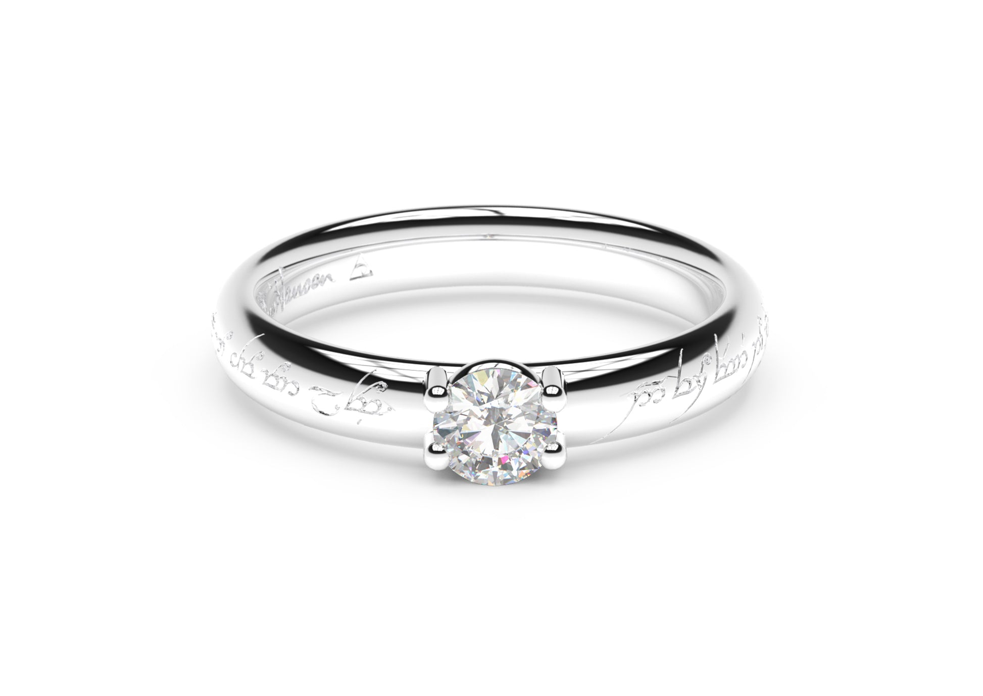 Elegant contemporary styling, fashioned in White metal, this ring features a four prong setting that showcases the brilliance of the diamond. The band has the same unique shape as our Famous replica Ring and is Engraved with our Elvish Love Poem putting this design a step above the ordinary.