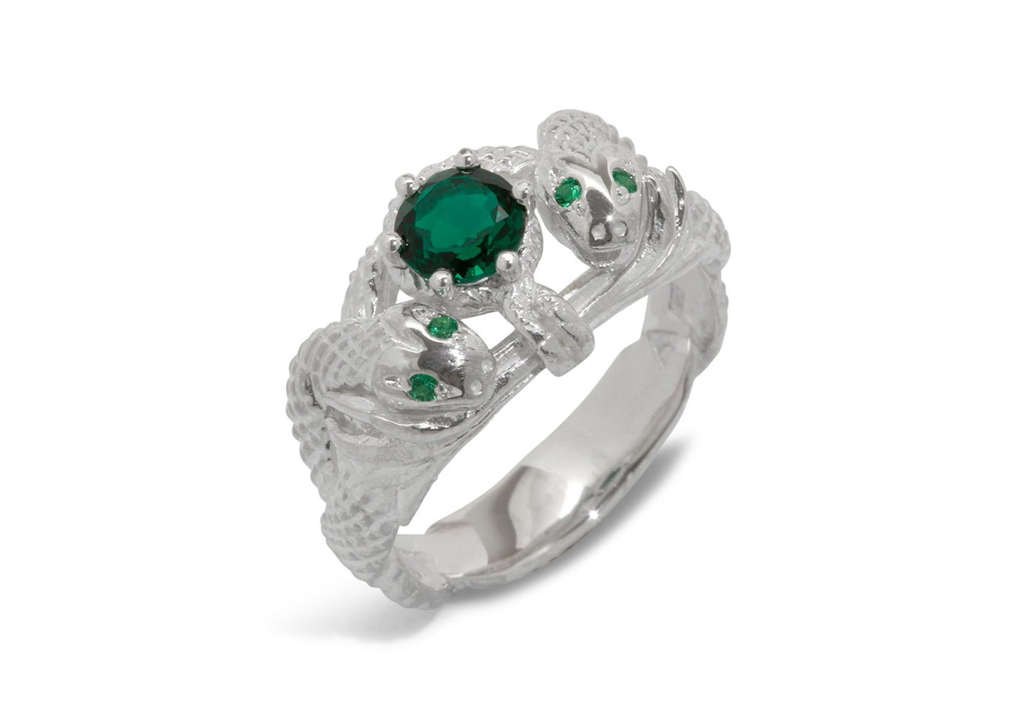 We have created our own interpretation of this ring based on descriptions of this ring given in the book. It was originally made in 18ct white gold, accompanied with 18ct yellow gold vines and set with a hexagon cut Biron Emerald and natural round cut Emeralds for the eyes.