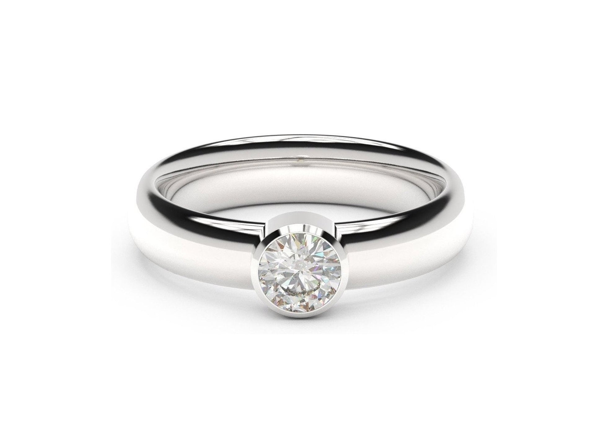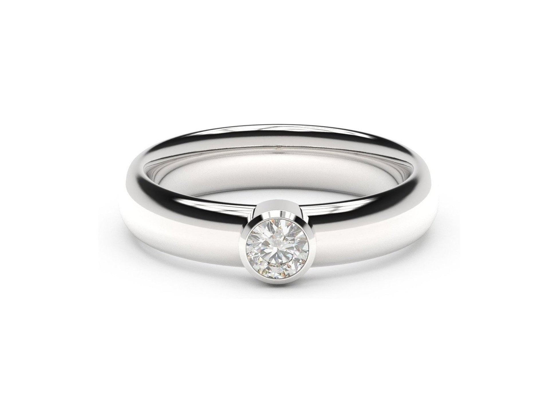 Stunning Modern styling, fashioned in White metal, this ring features a straight bezel style setting that showcases the brilliance of the diamond and provides ideal protection. The band has the same unique shape as our Famous replica Ring and is Engravable putting this design a step above the ordinary.