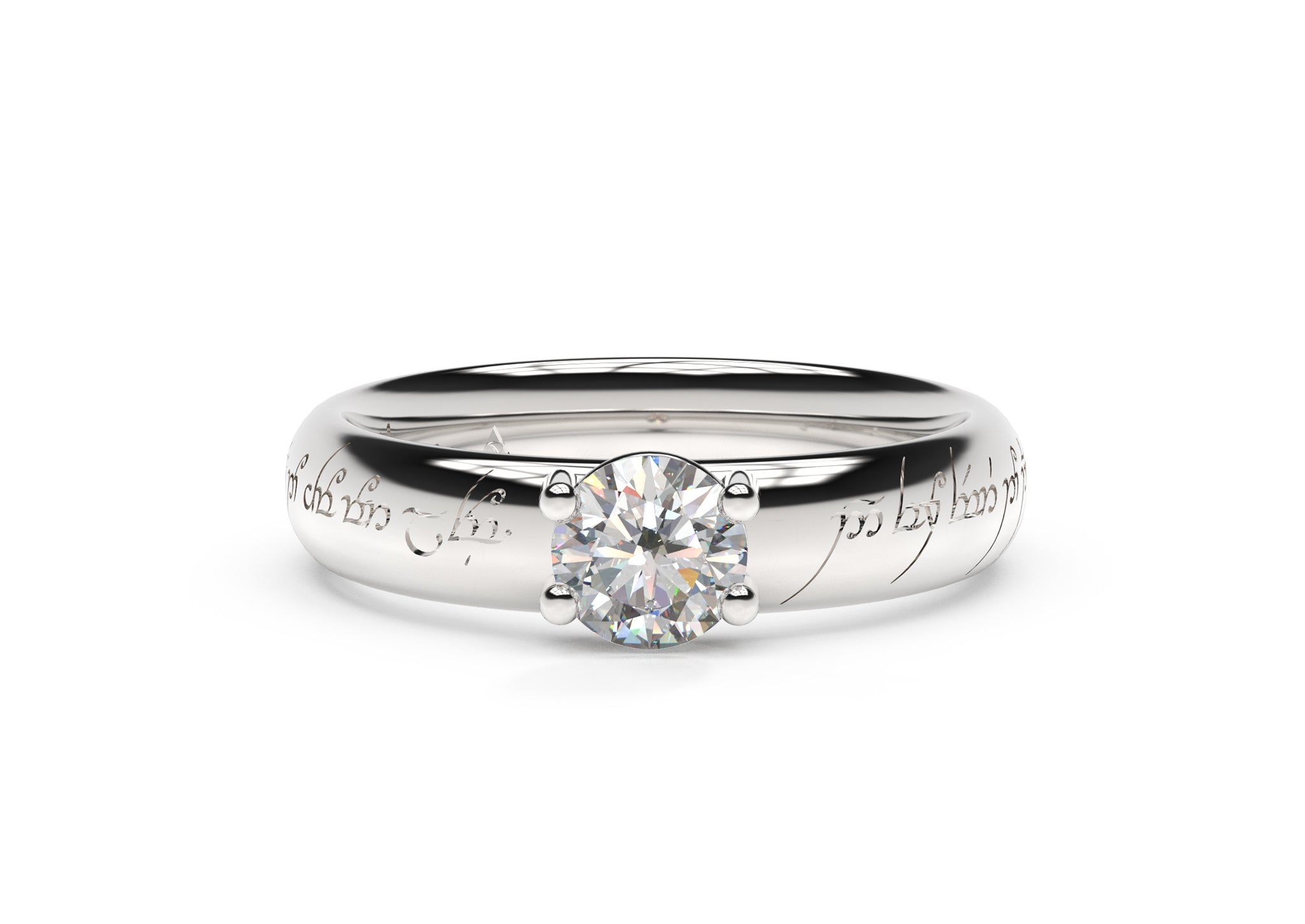 Elegant contemporary styling, fashioned in White metal, this ring features a four prong setting that showcases the brilliance of the diamond. The band has the same unique shape as our Famous replica Ring and is Engraved with our Elvish Love Poem putting this design a step above the ordinary.