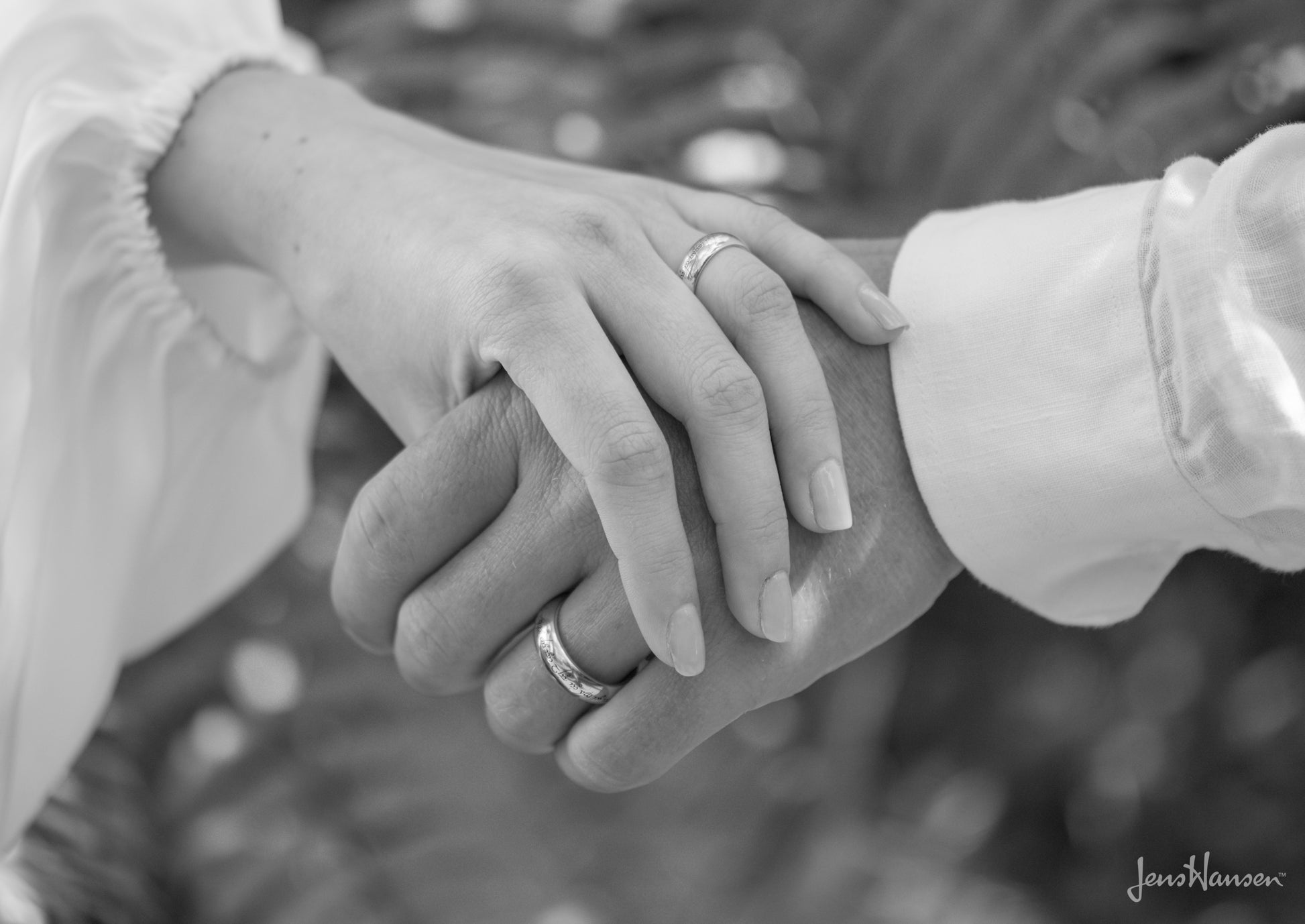This is the Jens Hansen Replica Ring in white gold matched with a 'little One' ring in white gold with the complete Elvish Love Poem beautifully laser engraved around the outside of each band.