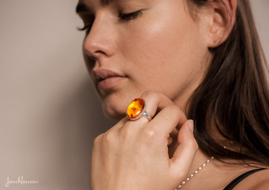 JW175 Oval Amber Ring, Sterling Silver