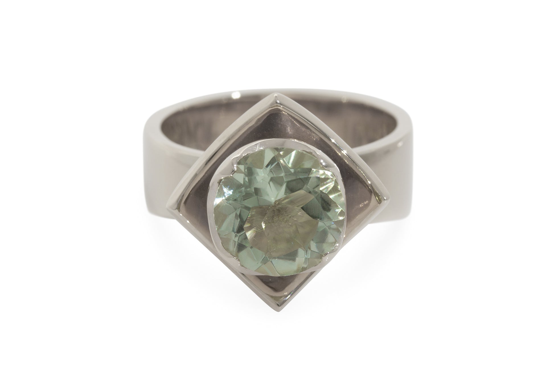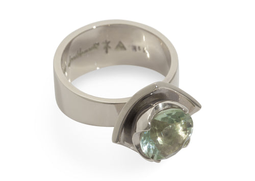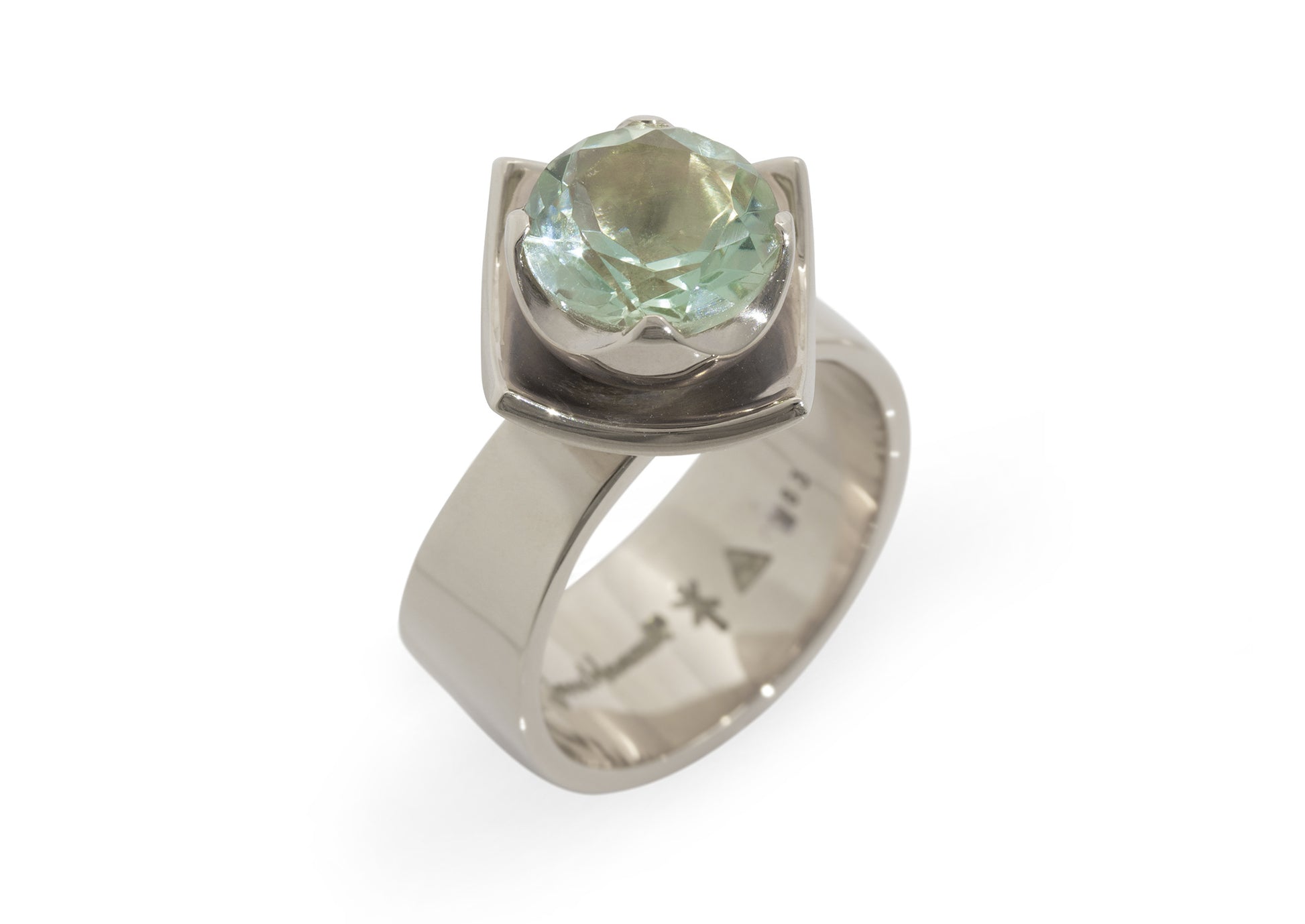This design is part of the Legacy Collection Foundation Release range, released in 2008. Originally made in sterling silver with an olive green cubic zirconia but has been re-imagined in 2020 in white gold with a pale green quartz.