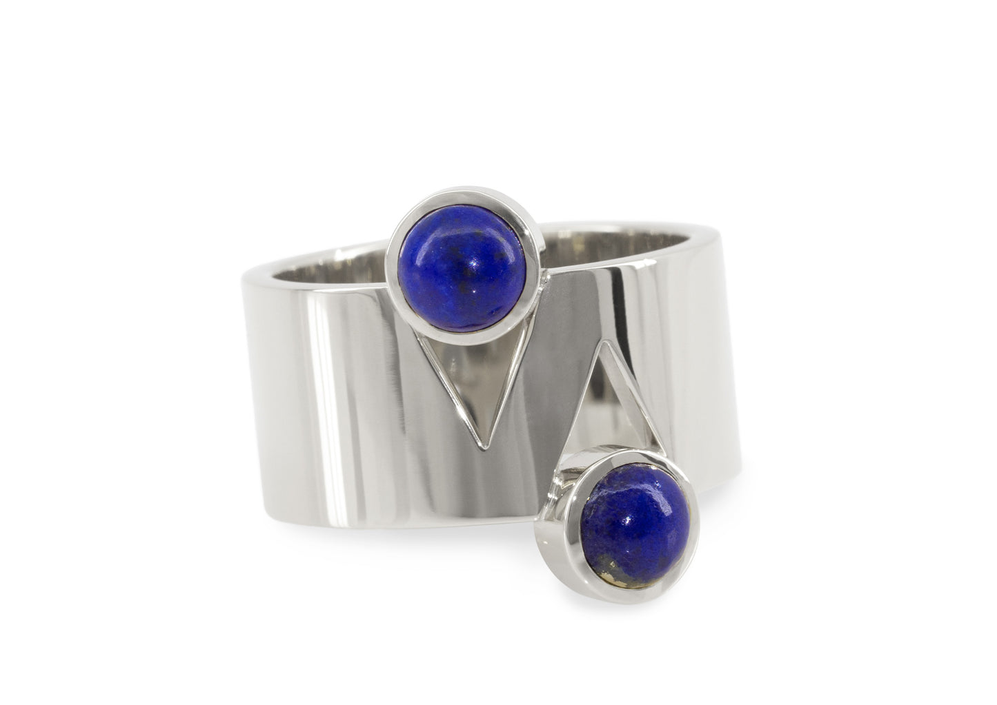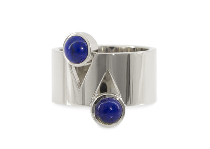 Desirable. Quietly playful. Crafted as a wide flat band with a polished finish, the 2025 edition features twin bezel-set 6m round cabochon gemstones, offset in distinctive “V” cut-outs – true to the original design from the Jens Hansen archive. Handmade in sterling silver and yellow gold, with a choice of gemstones.