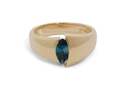 Alluring clean lines and modern style grace this semi tension setting Marquise cut gemstone ring. The strong yellow gold band securely clasps the gemstone without obvious support, letting it float above the finger in a dazzling display of light. The curves of the ring are elegant and refined, perfect for any occasion.