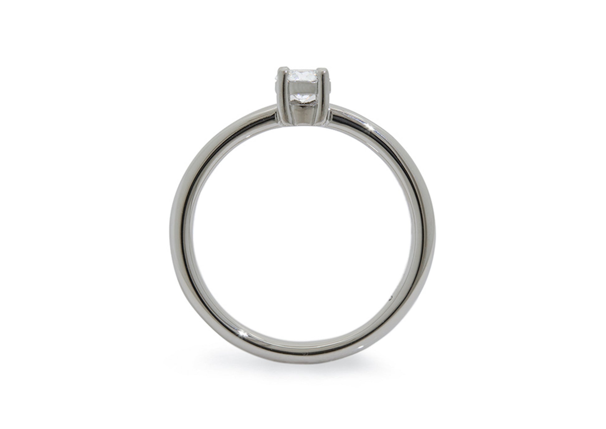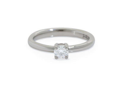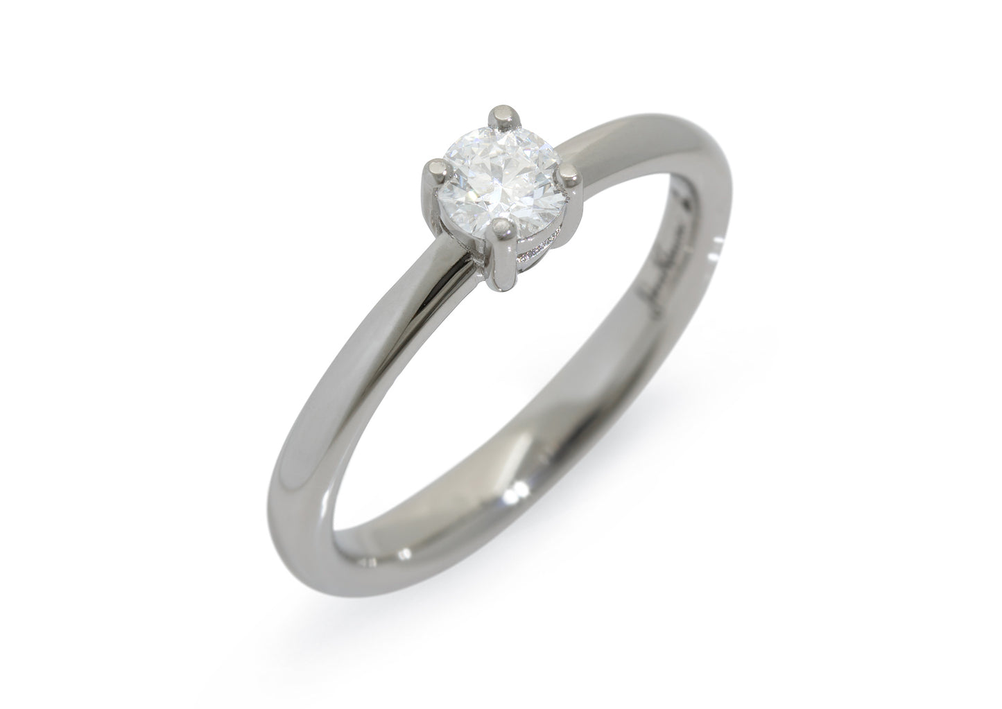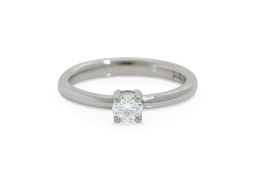 Our Aria engagement ring is a tribute to the classic beauty of a solitaire. Its subtle ethereal quality is often chosen by those who prefer a petite style that delivers a beautiful sparkle. It features a third of a carat round brilliant diamond in a four-pronged basket-style setting.