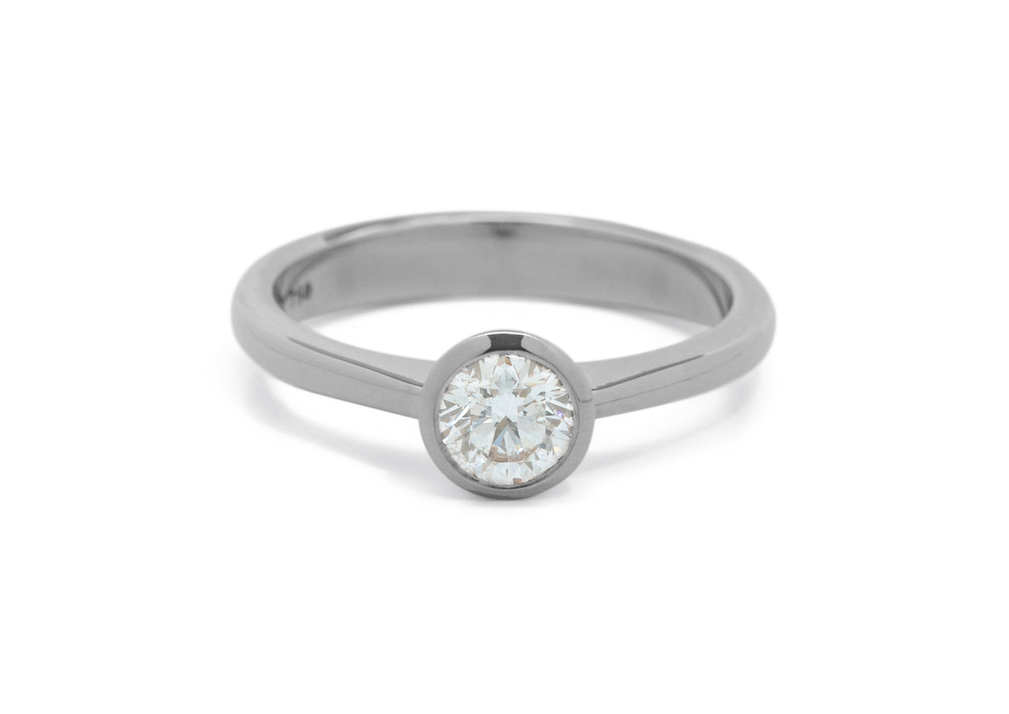 An elegant engagement ring in white gold featuring a half carat round brilliant diamond in a tapered bezel setting.