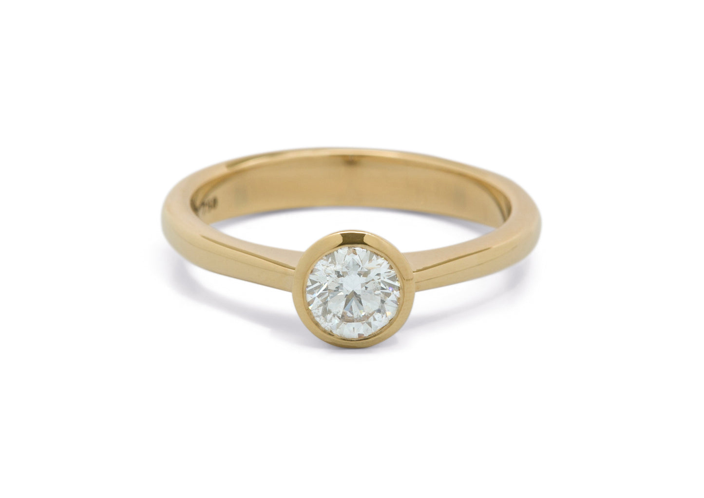 An elegant engagement ring in yellow gold featuring a half carat round brilliant diamond in a tapered bezel setting.