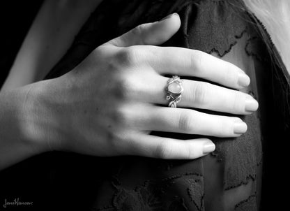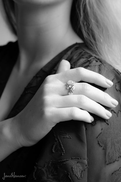 Spoil yourself or your beloved with a stunning Elven-inspired ring. This vine ring features an oval cabochon gemstone and two round brilliant diamonds.