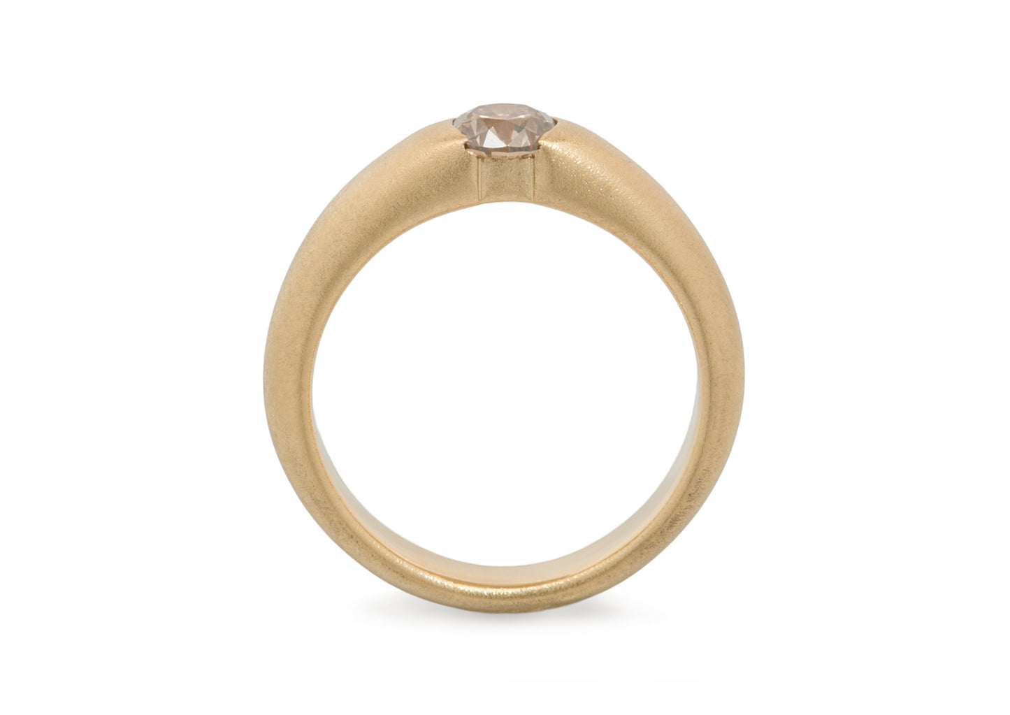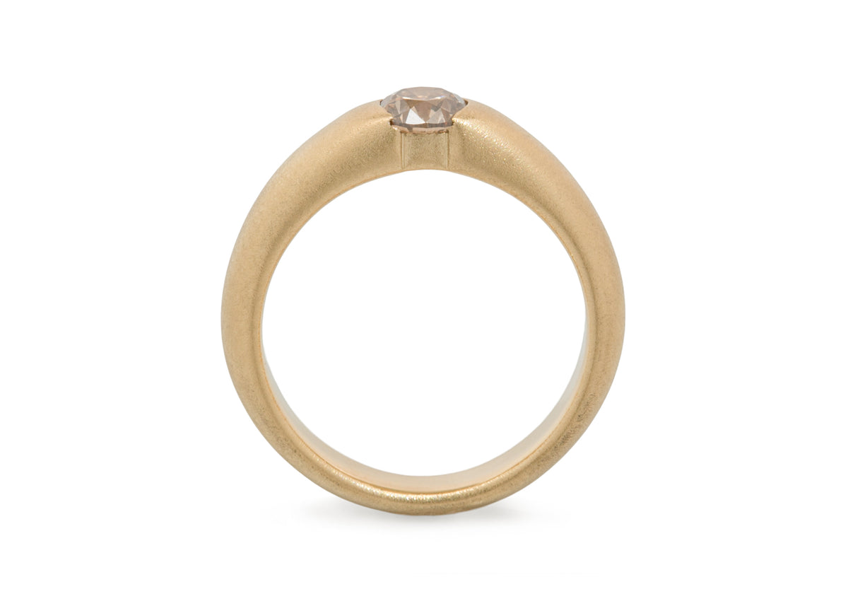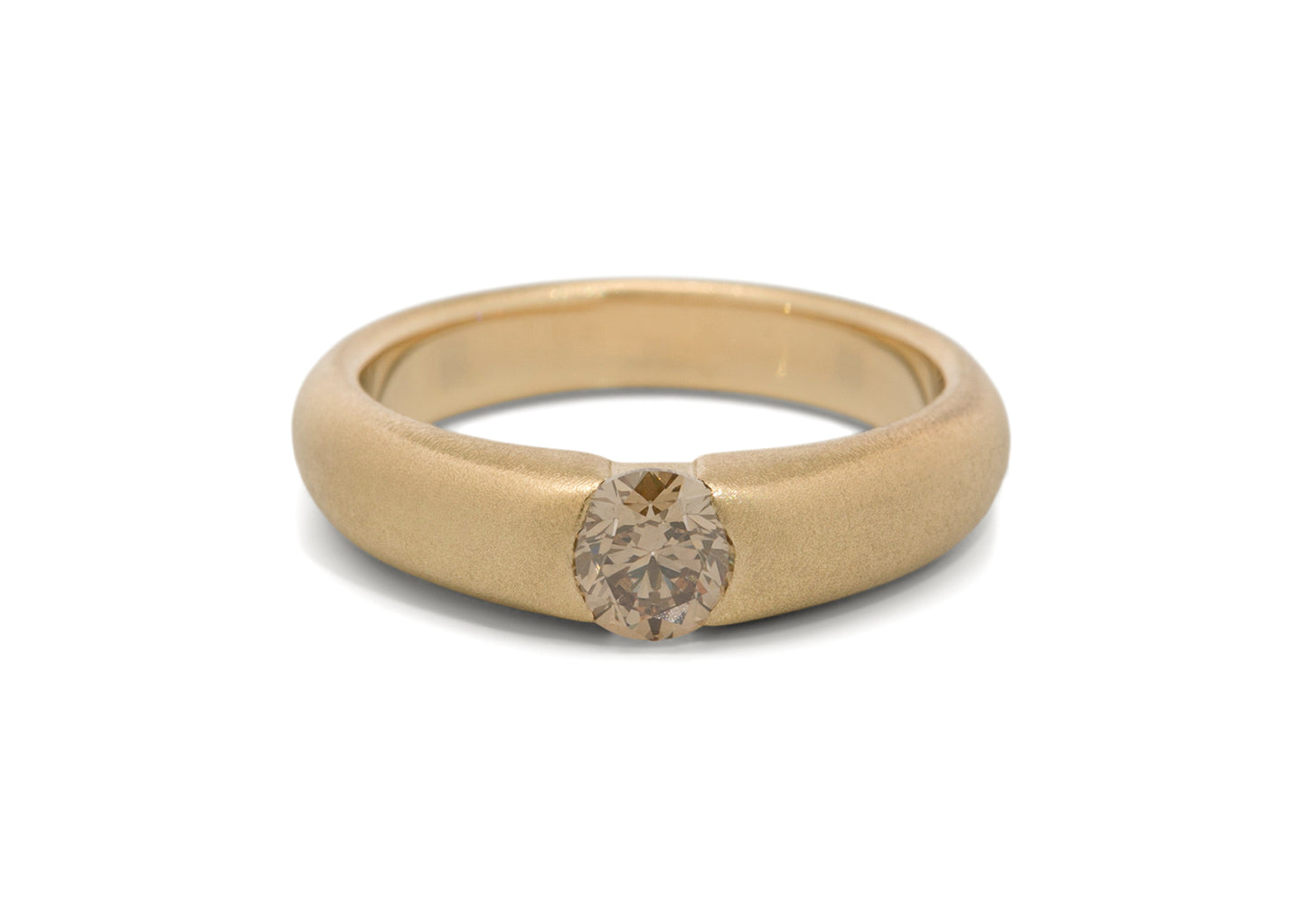 This bold and classic 18ct Gold ring has been designed to embrace the diamond in a semi tension setting, making it the designs main focus. We selected this high quality .50ct round brilliant cut Champagne Diamond for its radiance, striking presence and integrity.