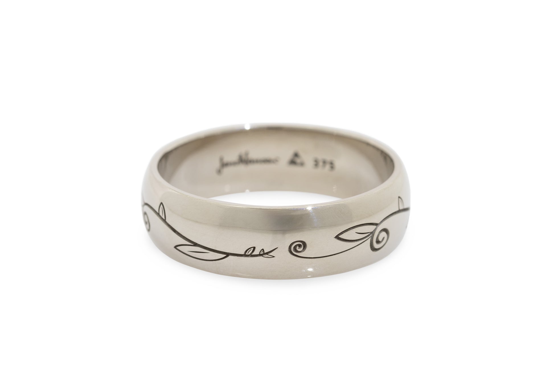 Crafted from 9ct white gold, this classic half-round band measures 7mm in width and 1.55mm in thickness. It features custom laser engraving inspired by the graceful patterns of vines and leaves, creating an elegant and timeless piece.