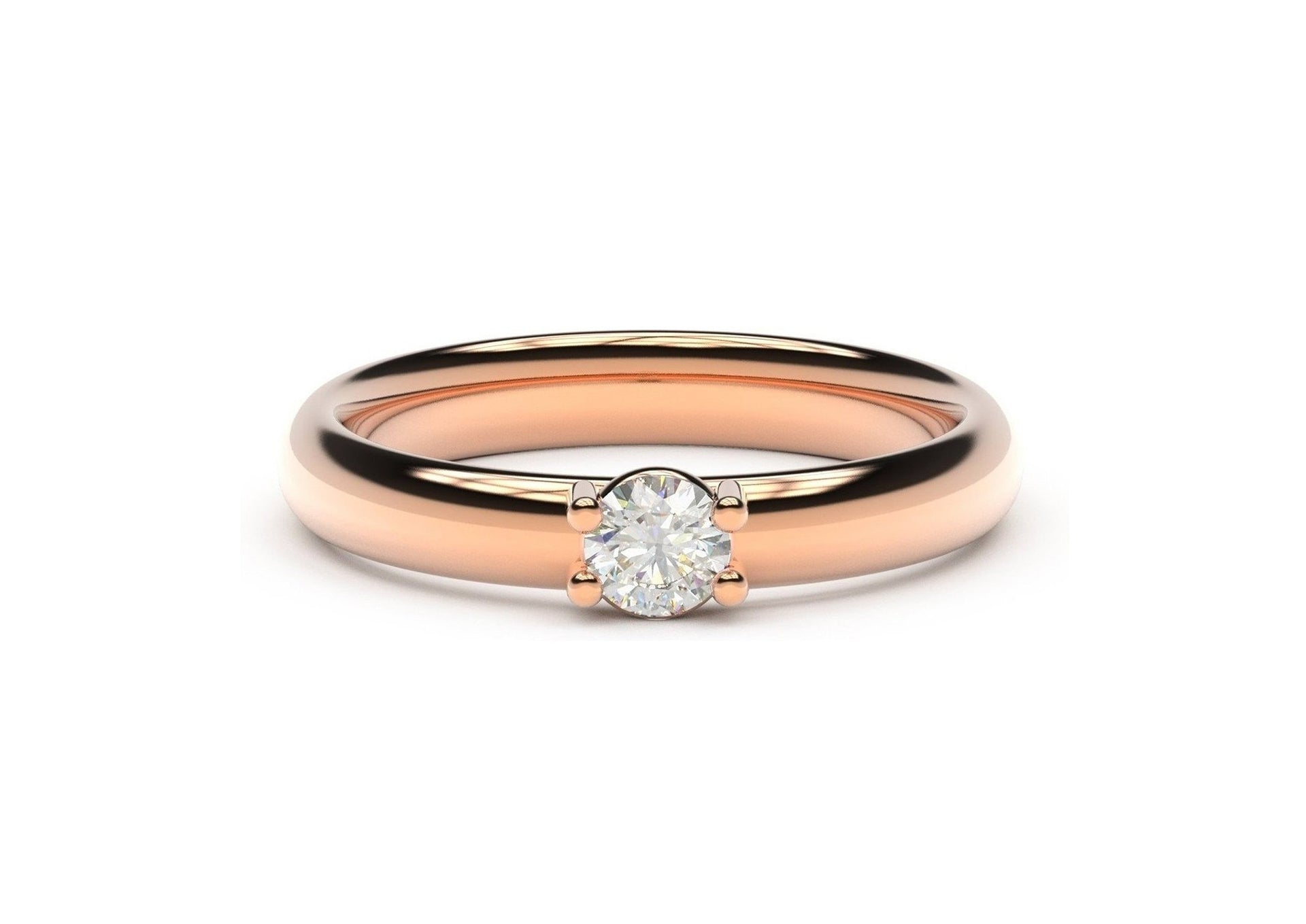 Elegant contemporary styling, fashioned in Red Gold, this ring features a four prong setting that showcases the brilliance of the diamond. The band has the same unique shape as our famous replica Ring and is Engravable putting this design a step above the ordinary.