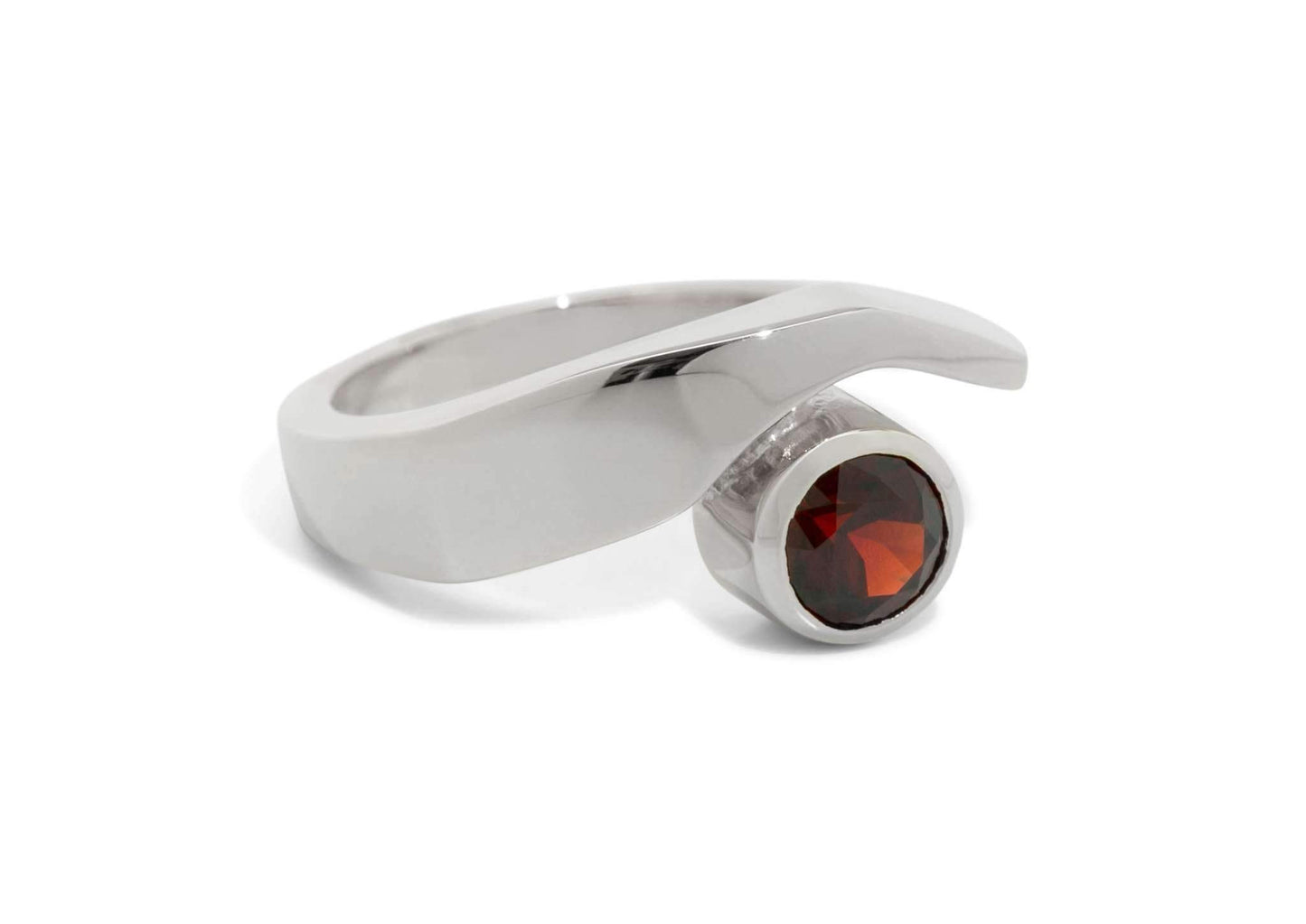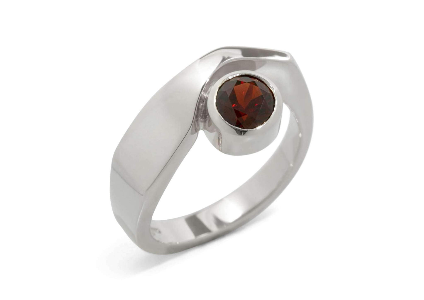 This stunning contemporary ring features a round faceted bezel set gemstone. The ring gives the impression of being cut, to make room for the gemstone, snuggled deep and secure in its own solid gold band. A ring suitable for any occasion.