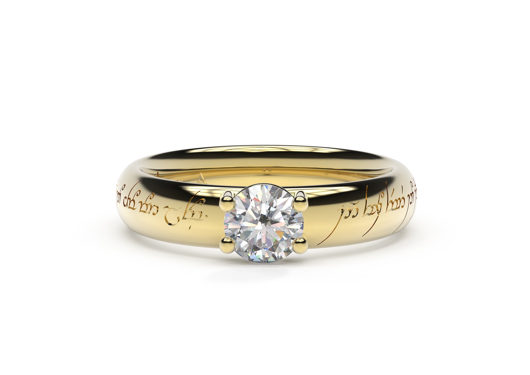 Elegant contemporary styling, fashioned in Yellow Gold, this ring features a four prong setting that showcases the brilliance of the diamond. The band has the same unique shape as our Famous replica Ring and is Engraved with our Elvish Love Poem putting this design a step above the ordinary.