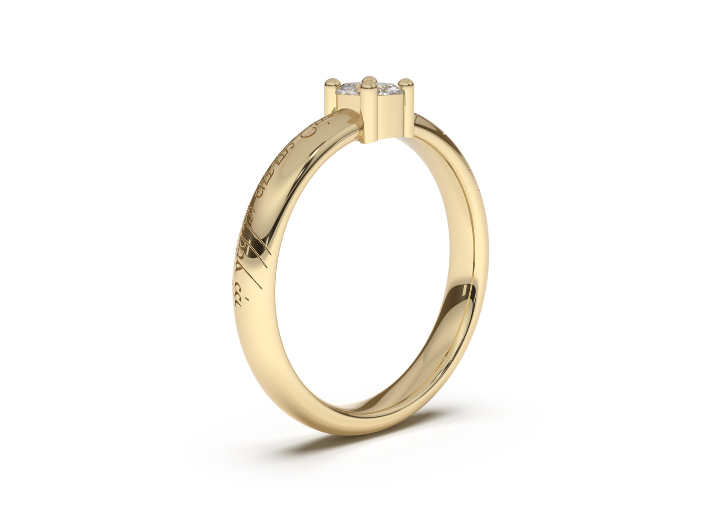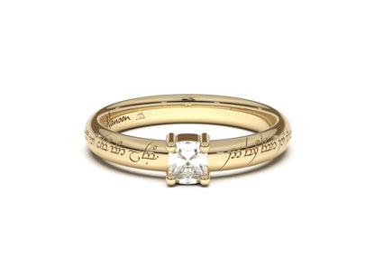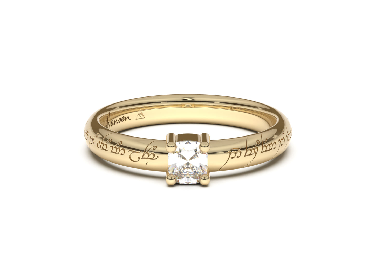 The engraving is often what truly gives a ring its meaning. You can choose your own Elvish (or any other language) engraving for both inside and outside the ring.The Elvish Love Poem fits perfectly on the outside of the ring:One ring to show our love,One ring to bind us,One ring to seal our love,And forever to entwine us.