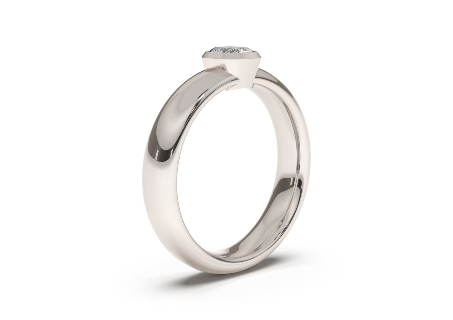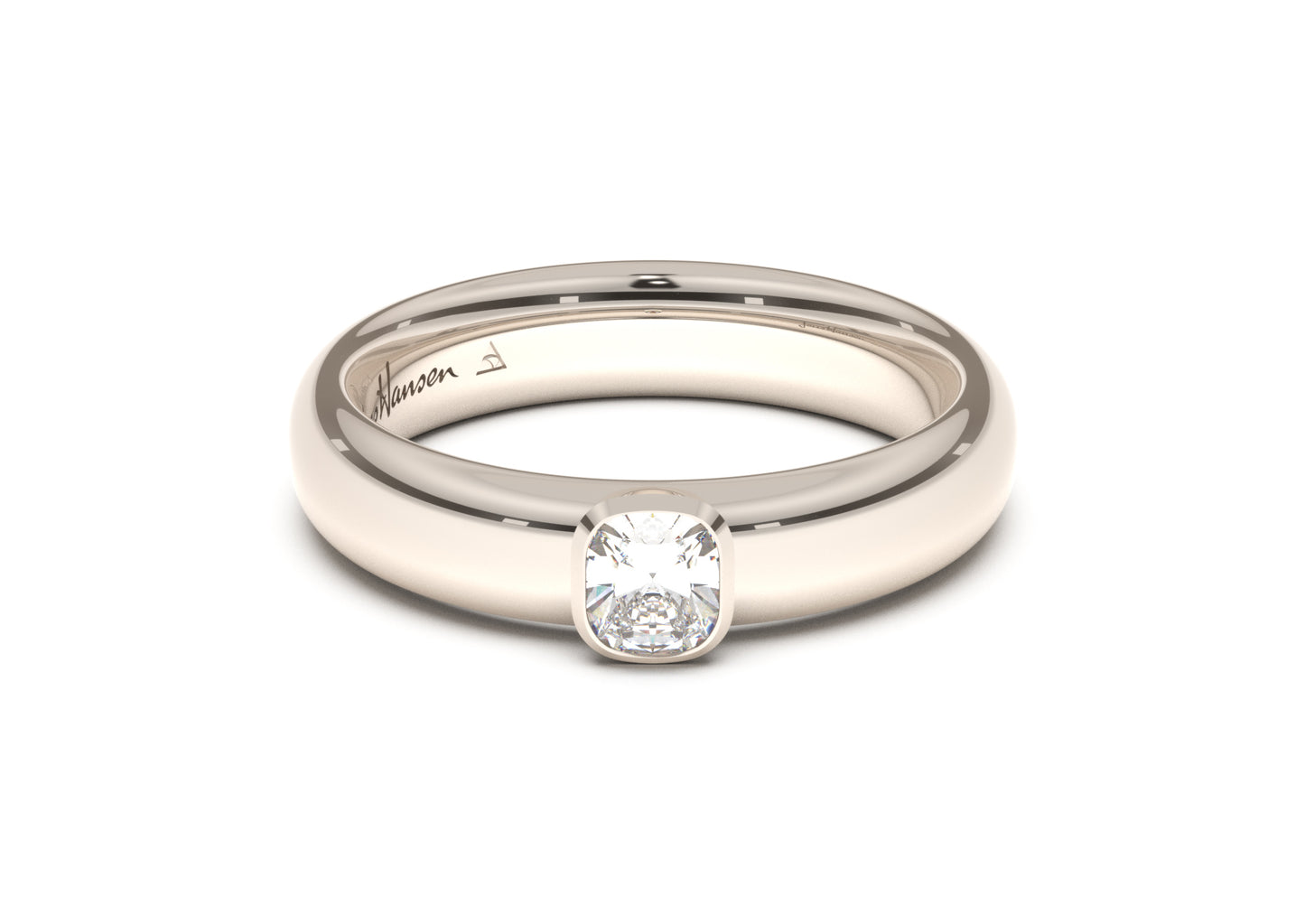 Elegant contemporary styling, fashioned in white gold or platinum, this ring features a tapered bezel setting that showcases the brilliance of the cushion cut diamond.