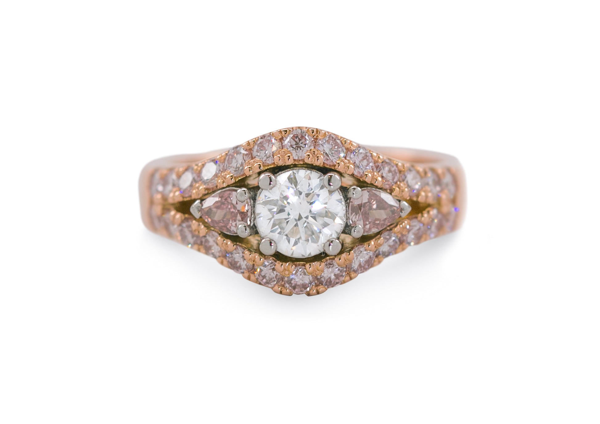Custom designed red gold ring with central platinum setting featuring a round white diamond with two pear shaped pink diamonds on each side, surrounded by twenty six stunning pink diamonds on the band.