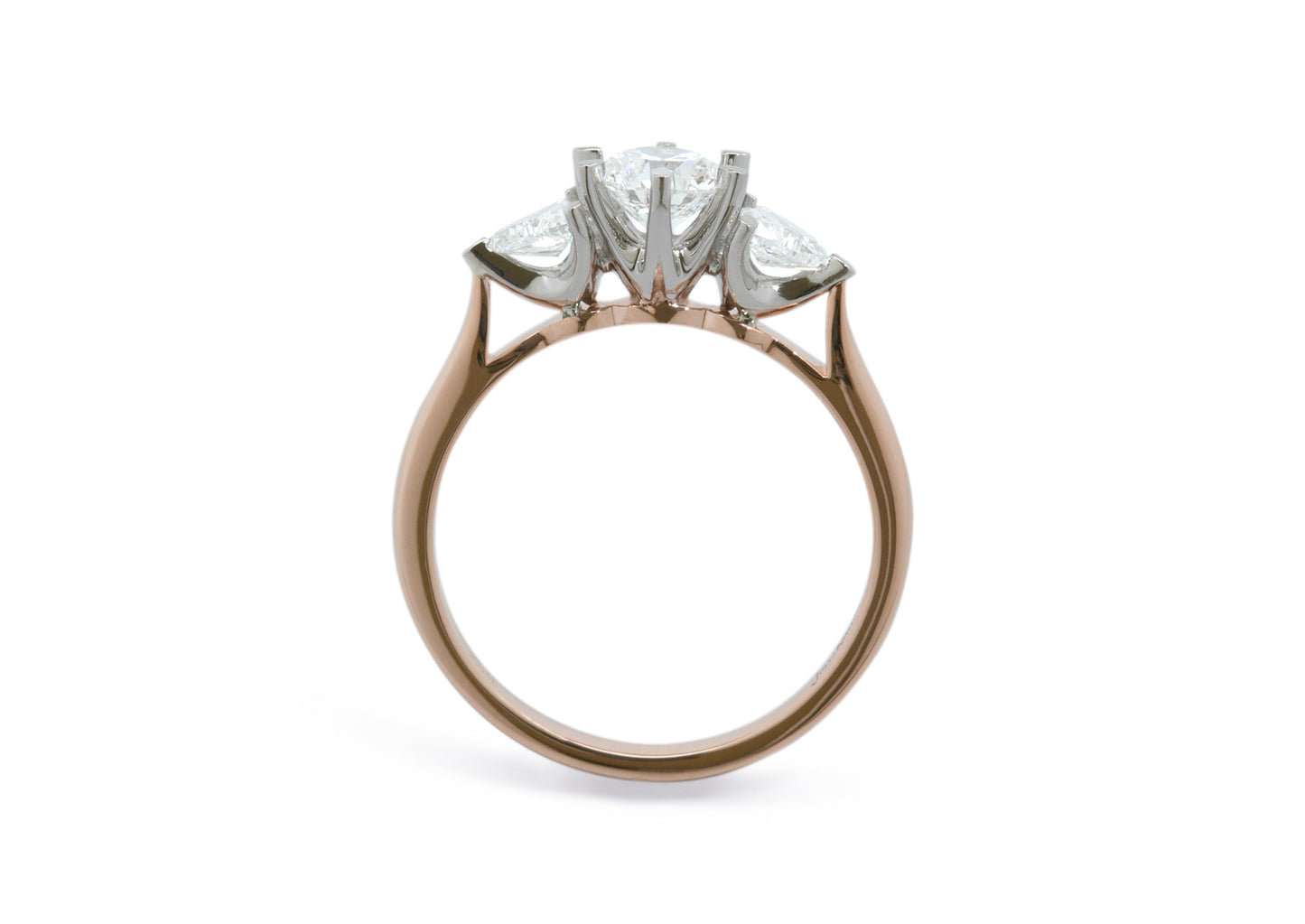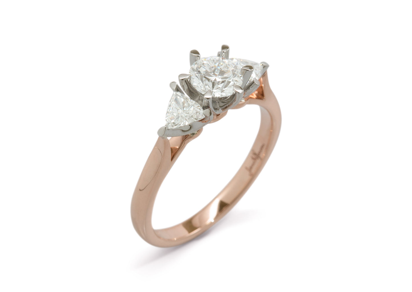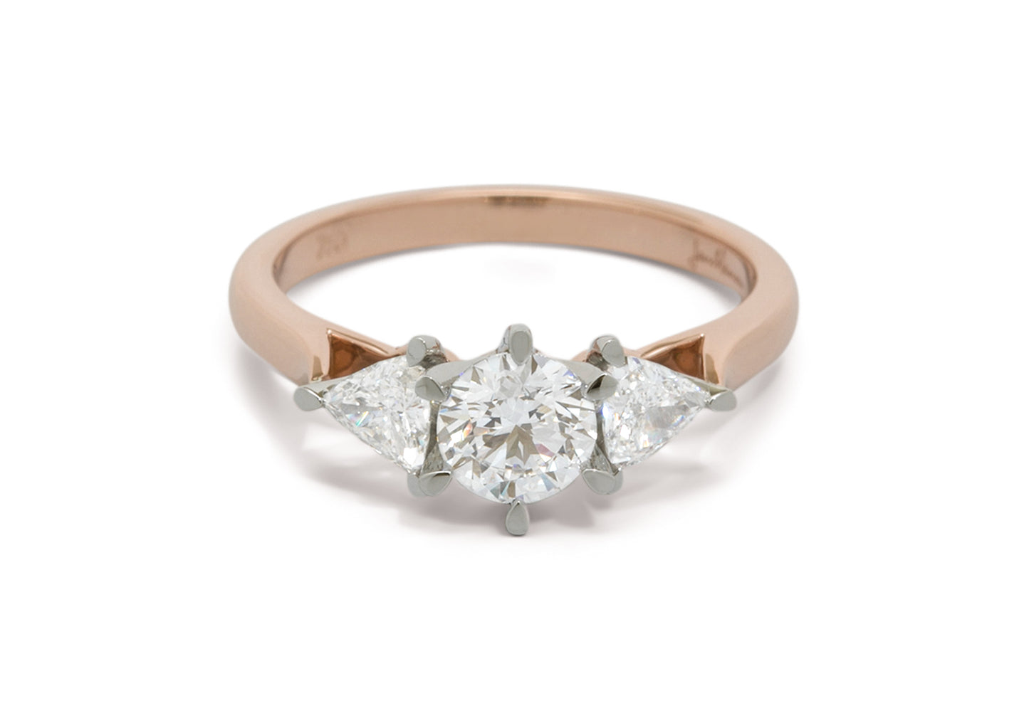 Custom CAD designed engagement ring in 18ct red gold with a platinum claw setting featuring a .75ct round brilliant diamond and two .25ct trillion cut diamonds.