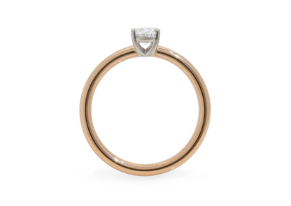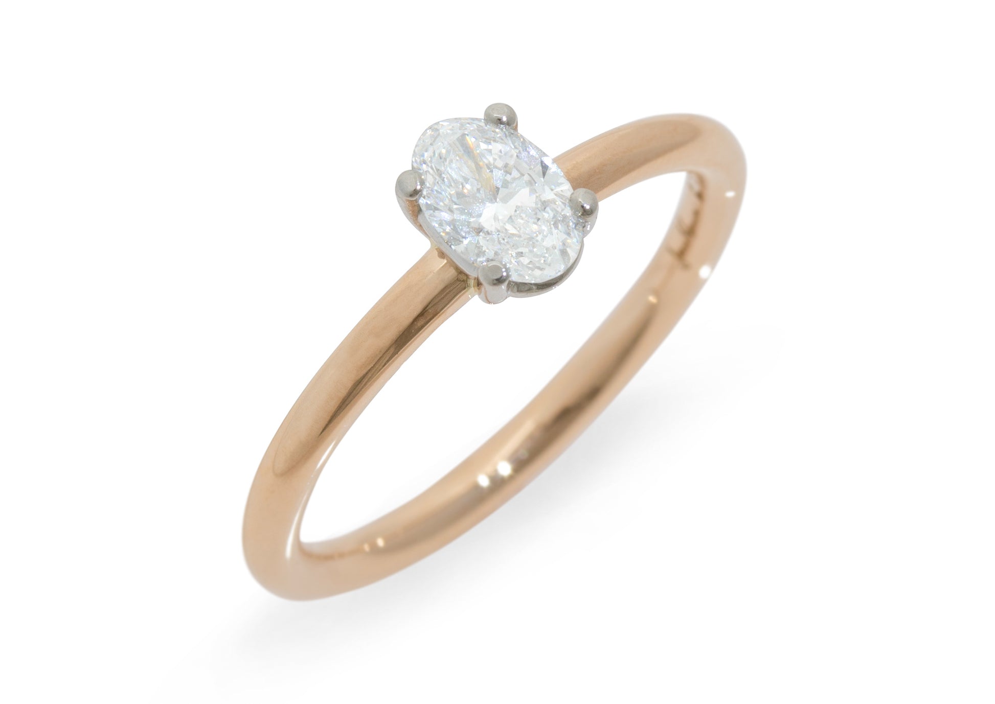 A solitaire design with a minimalist slim round band in red gold with an oval diamond in a platinum four claw setting. It's all about the diamond with this one!