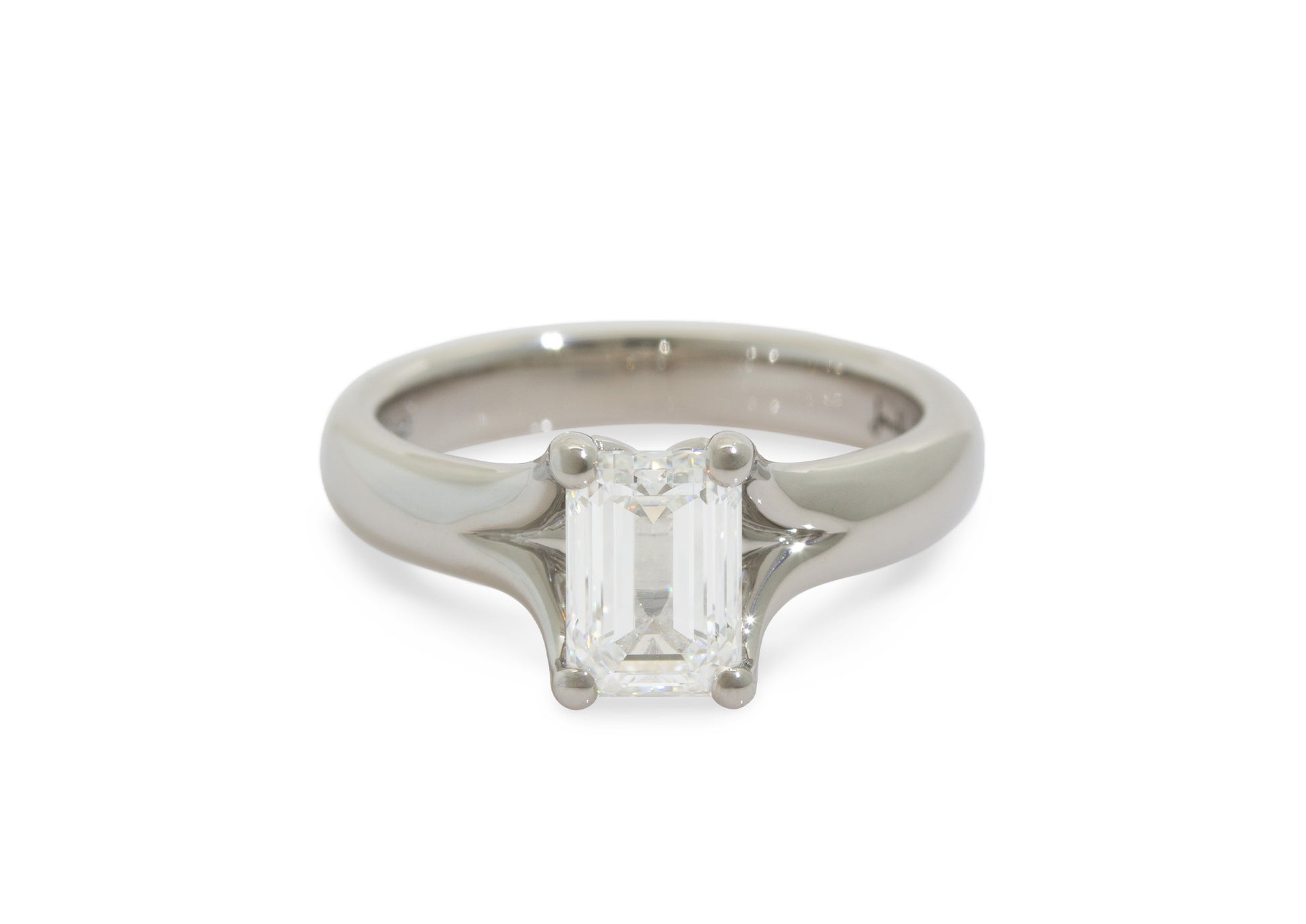 This exquisite 3mm platinum band, crafted through custom CAD design, features a 4-prong setting that showcases a 1.20ct E VS1 7x5mm rectangular emerald-cut diamond, certified GIA. Designed to match the JW647 Petite replica ring.