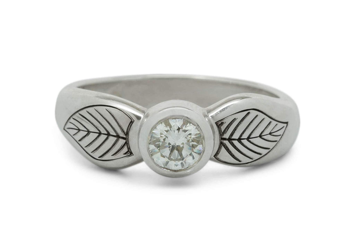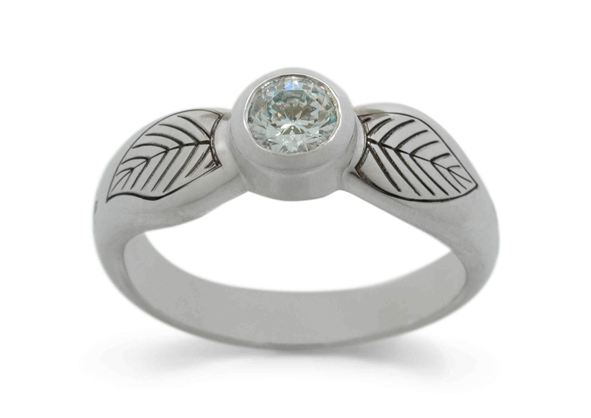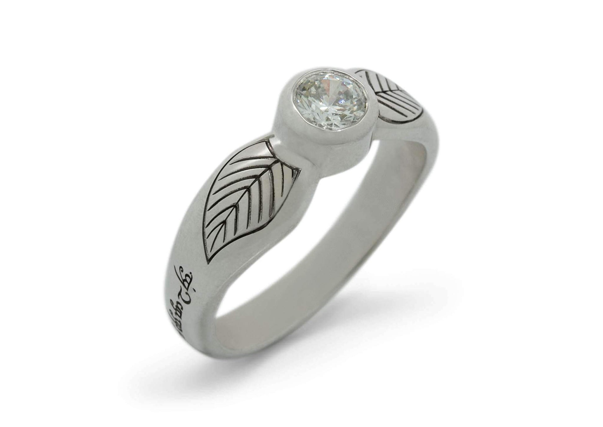 Inspired by all things Elvish, we created this stunning ring. The ring has a bezel set round stone and it can be engraved with side leaves and a personalised message of your choice, the inside may also be engraved depending on the length of your message.