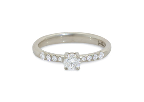 Named for the Greek god of love, our Eros engagement ring is gracefully styled with nine diamonds to catch and radiate the light. It features a third of a carat round brilliant diamond in a four-pronged, basket-style setting, and eight diamonds tapering in size on its shoulders.