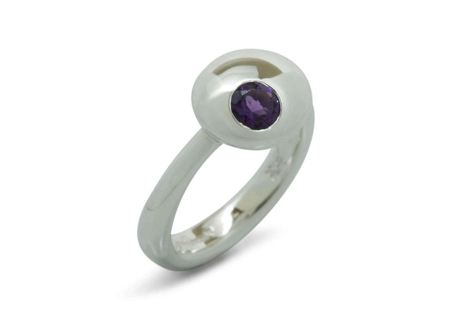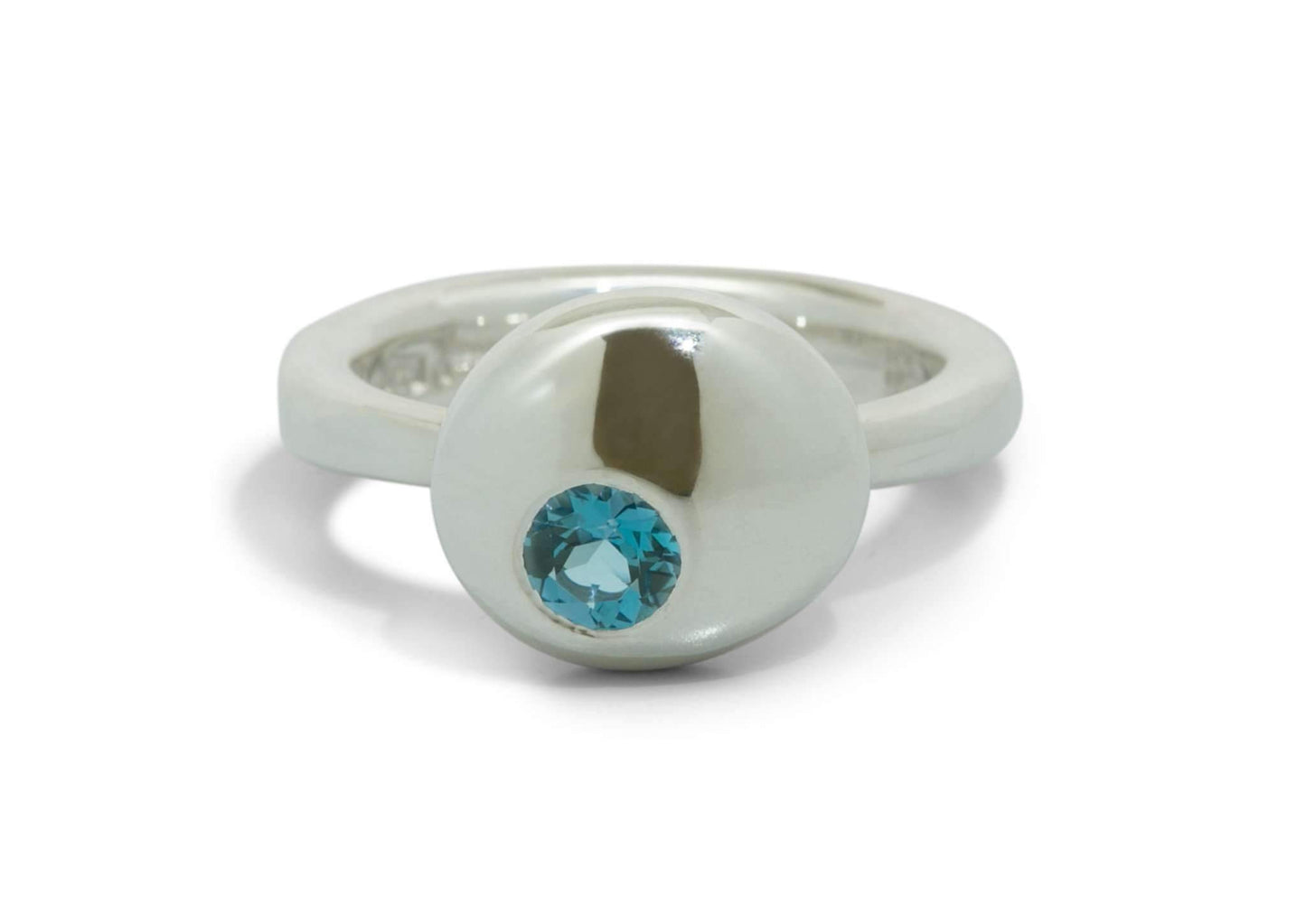 Simple but sumptuous, this sterling silver button style ring is the perfect little touch to complete an outfit. A customisable version of our signature organic button design. The ring features a cleverly offset round faceted gemstone of your choice.