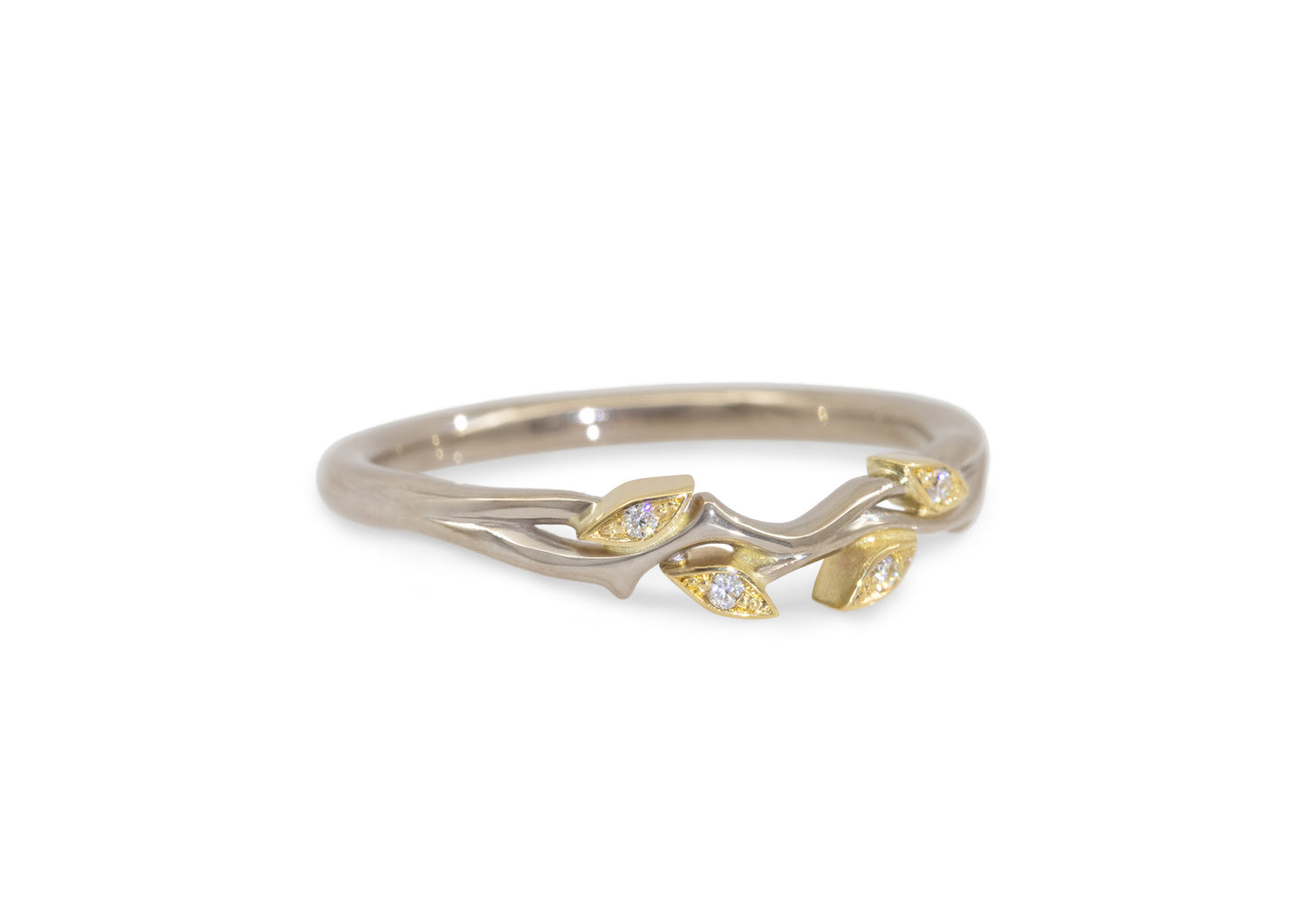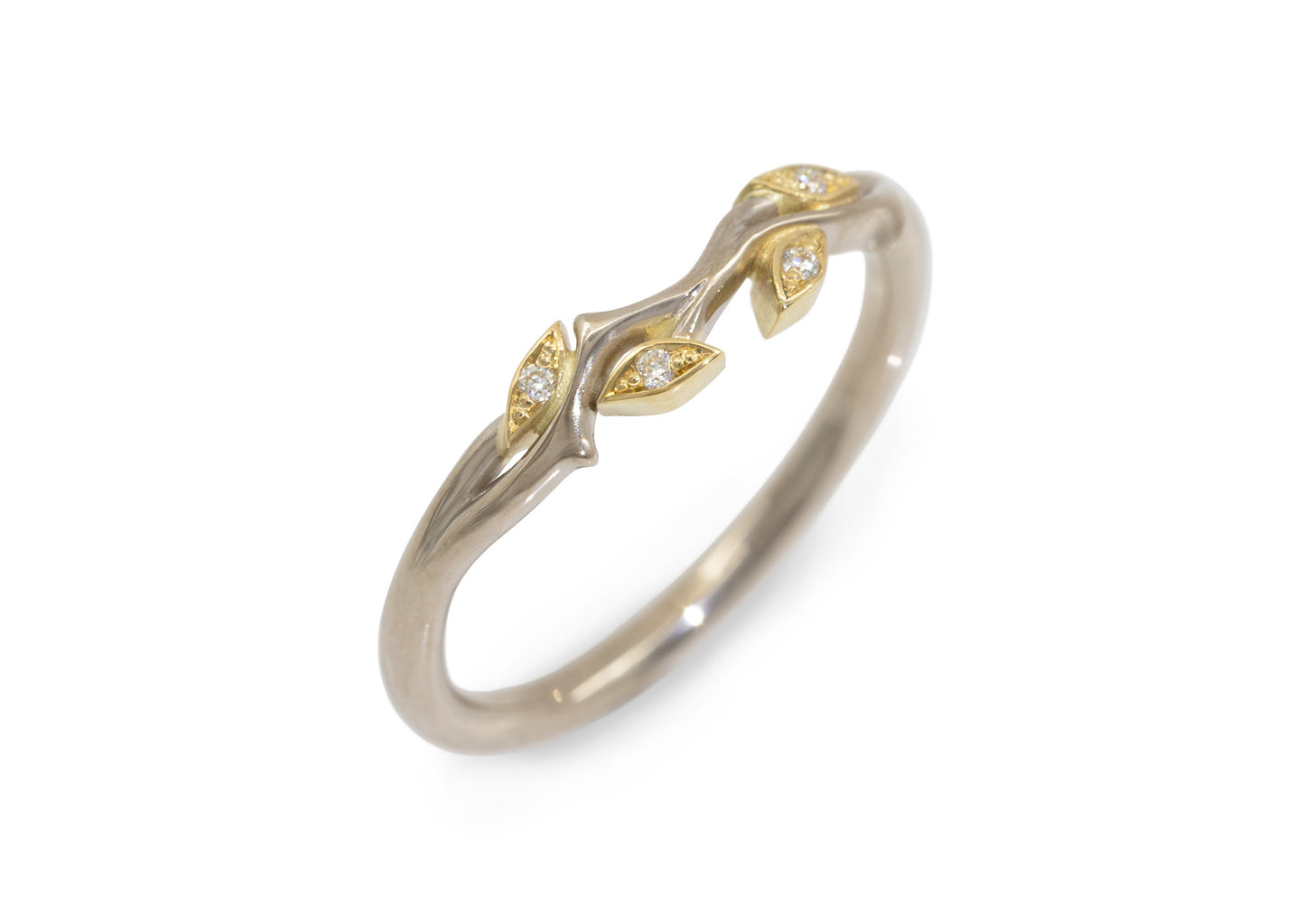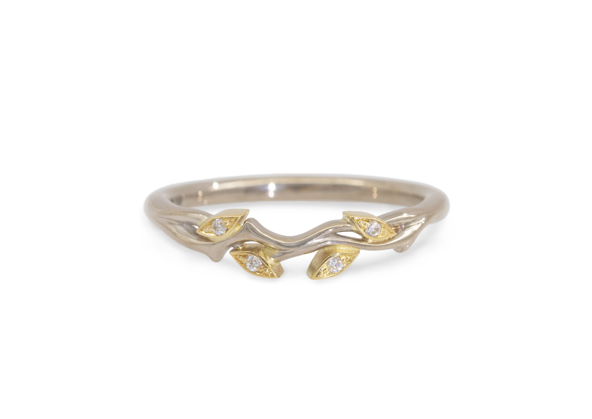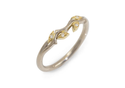 This custom-designed 18ct white and yellow gold wedding band is crafted to perfectly complement the Custom J3062 Engagement ring. Featuring four yellow gold leaves adorned with 1mm round moissanites set in a delicate pavé style, it offers an elegant and refined symbol of love.