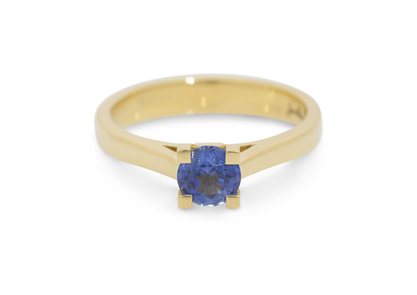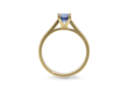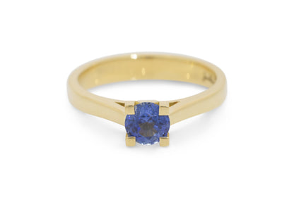 Solitaire engagement ring in yellow gold featuring a natural blue sapphire in a four square pronged setting.
