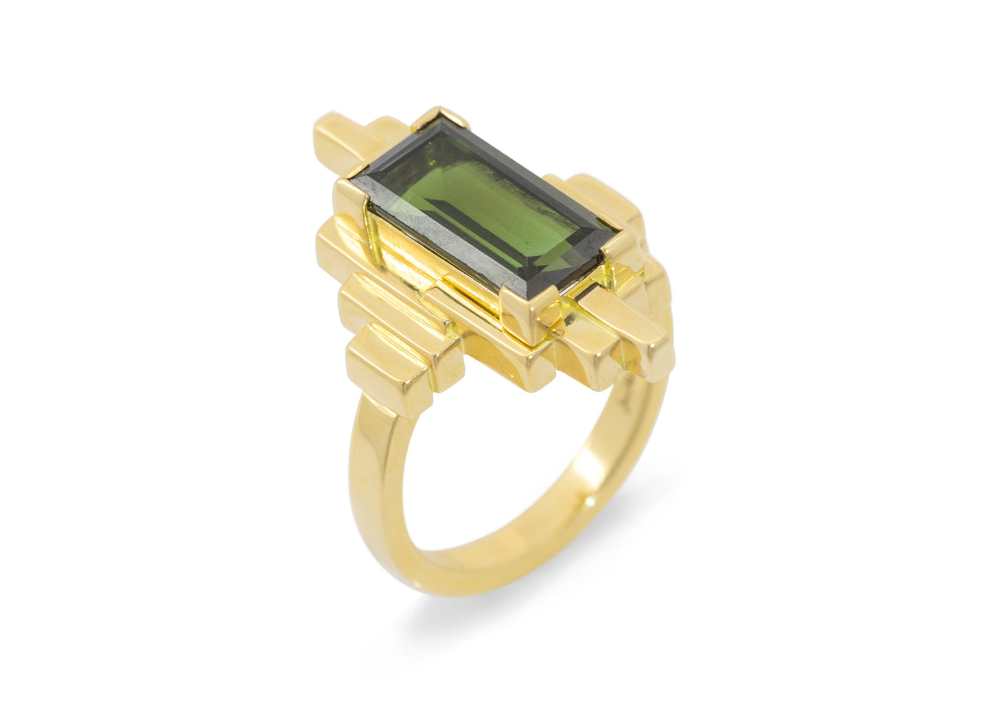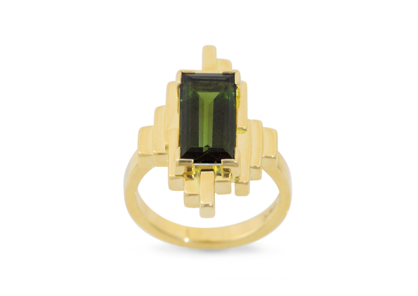 An art-deco inspired 18ct yellow gold ring, handcrafted by our master goldsmith. This singular piece features a 4.36 ct rectangle baguette-cut green tourmaline, chosen for its striking colour and precise cut.