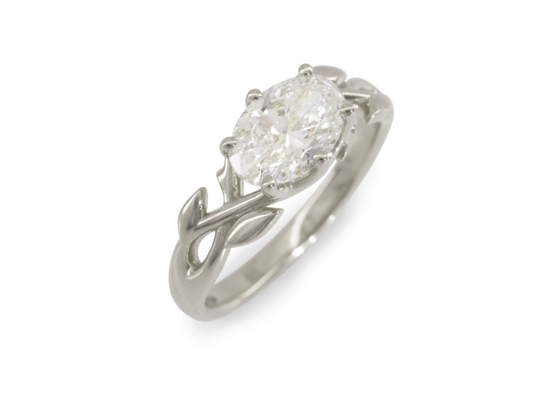 A white gold & platinum engagement ring featuring a 2-carat oval faceted lab-grown diamond set in an east–west orientation. Leaf and vine details complete the design, which pairs with the matching J3339 Vine Wedding Band.