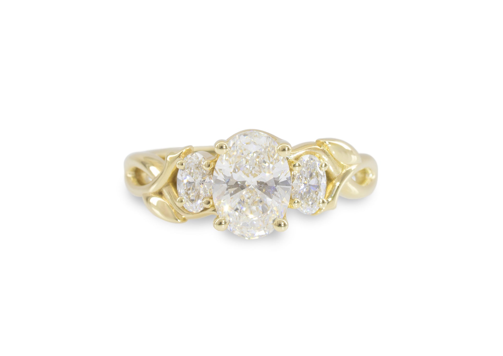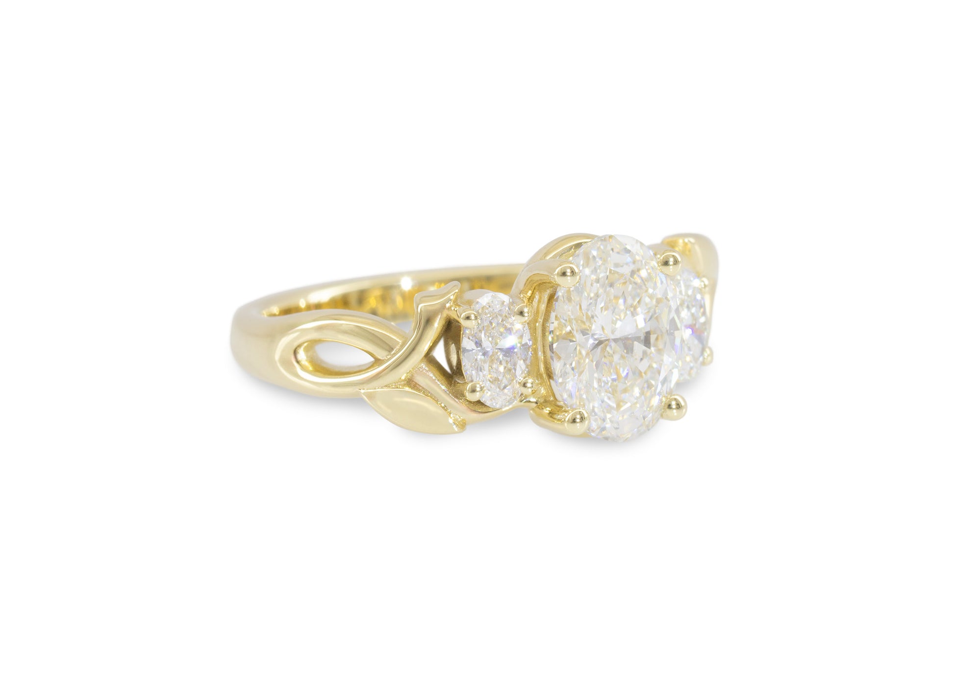 A yellow gold engagement ring featuring a 1.5-carat oval faceted lab-grown diamond set in an east–west orientation, with two 0.25-carat oval diamonds on either side. Leaf and vine details complete the design, which pairs with the matching J3343 Vine Wedding Band
