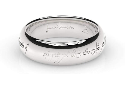 The engraving is often what truly gives a ring its meaning. You can choose your own Elvish (or any other language) engraving for both inside and outside the ring.The Elvish Love Poem fits perfectly on the outside of the ring:One ring to show our love,One ring to bind us,One ring to seal our love,And forever to entwine us.