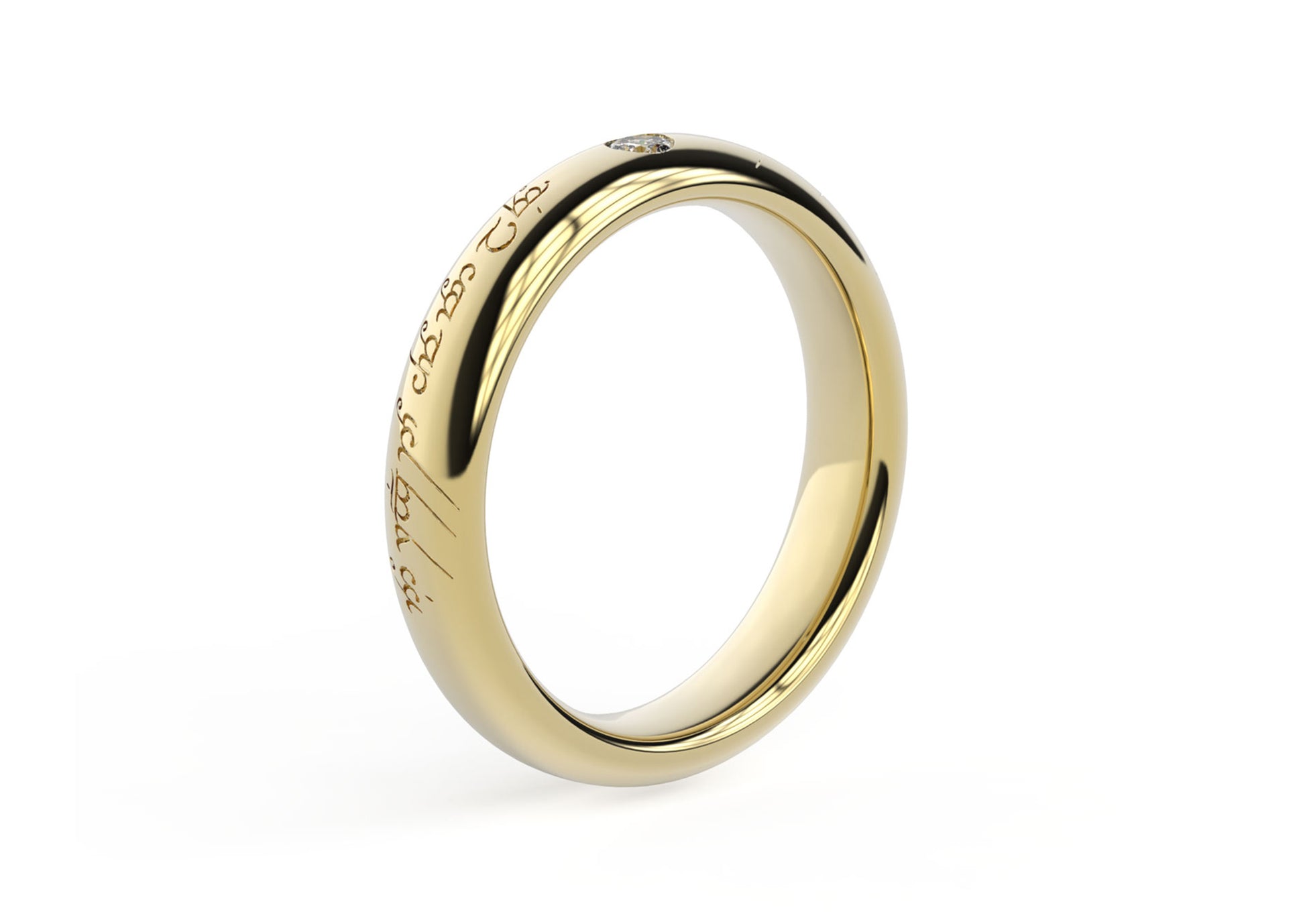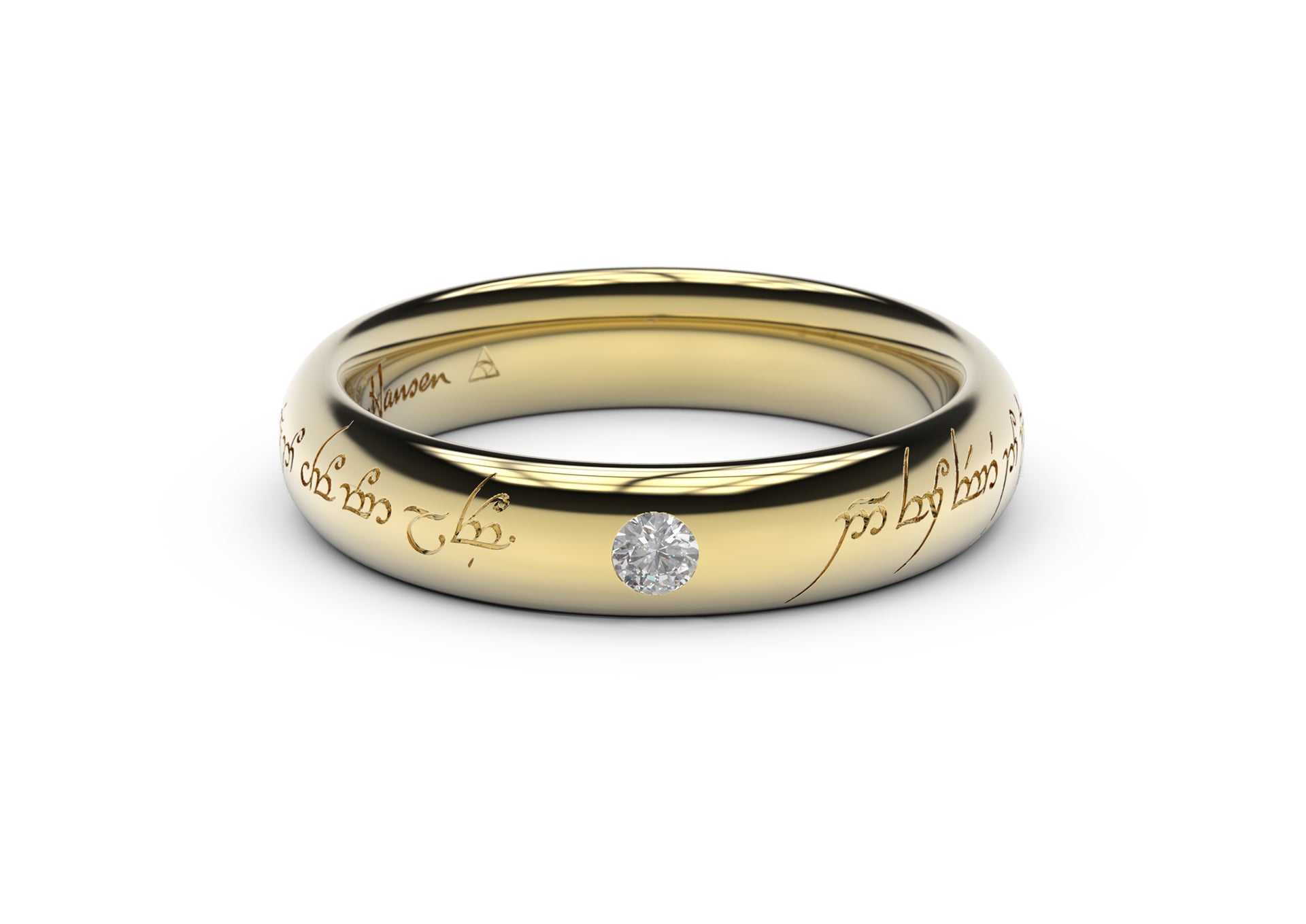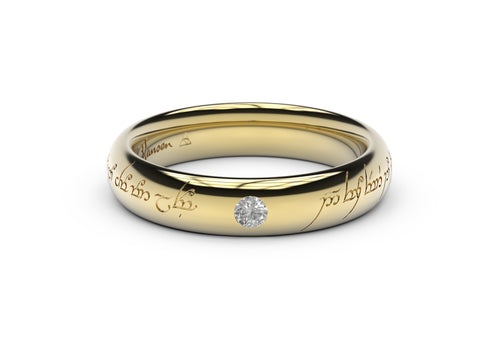 Elegant contemporary styling, fashioned in Yellow Gold, this ring features a Flush setting that showcases the brilliance of the diamond. The band has the same unique shape as our famous Ring and is Engraved with our Elvish Love Poem putting this design a step above the ordinary.