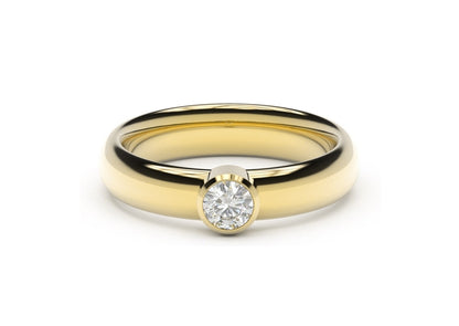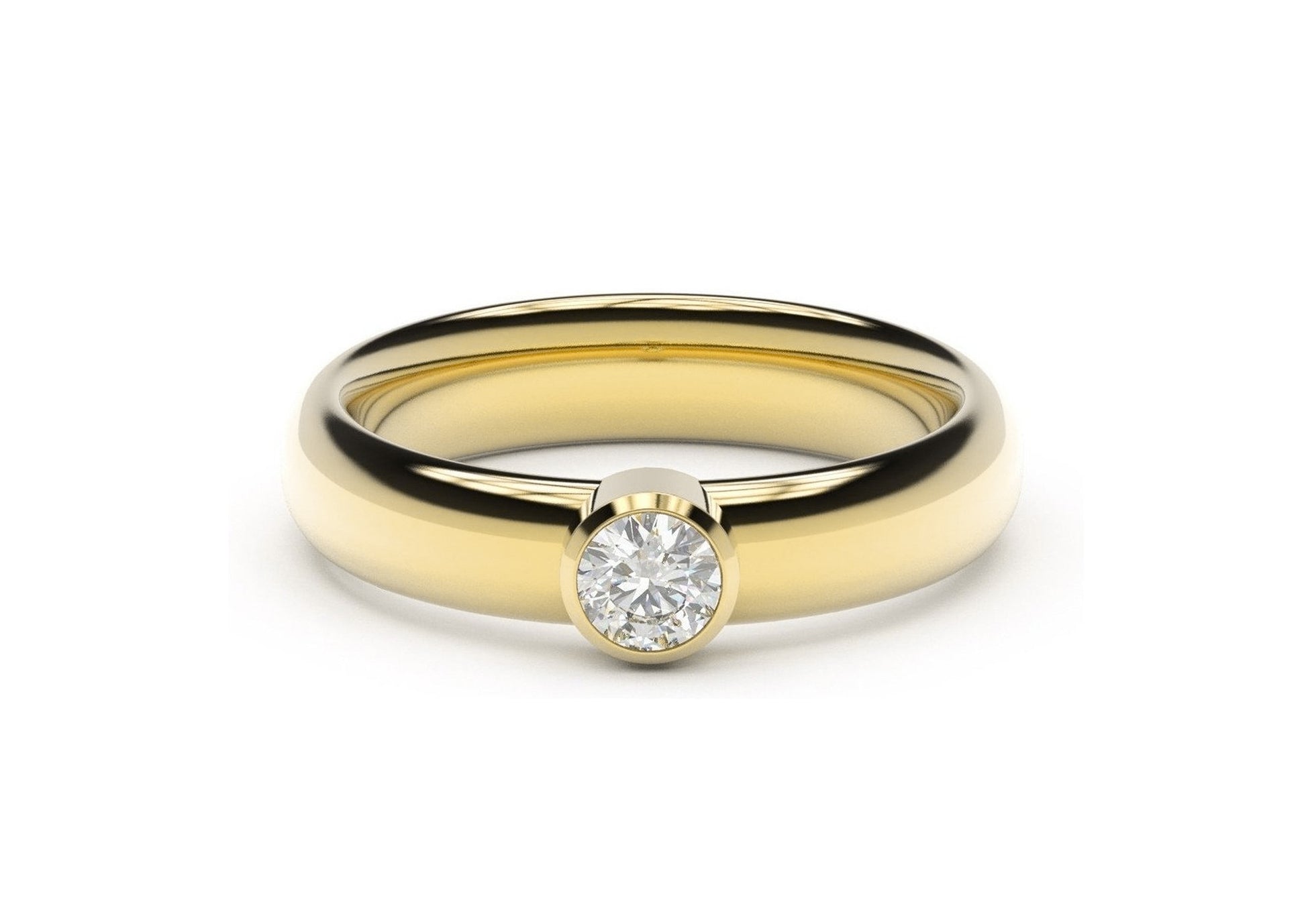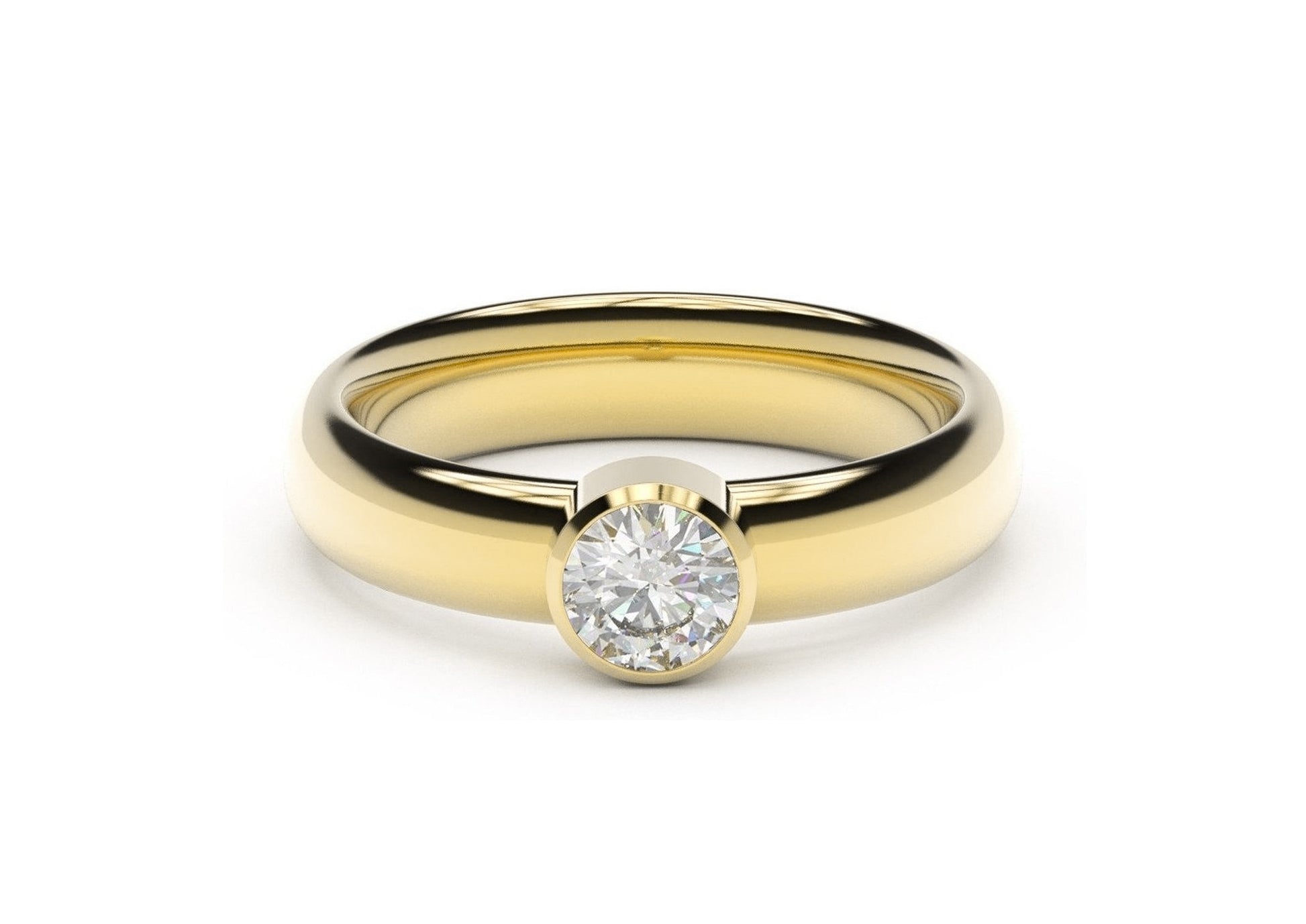 Stunning Modern styling, fashioned in Yellow Gold, this ring features a straight bezel style setting that showcases the brilliance of the diamond and provides ideal protection. The band has the same unique shape as our Famous replica Ring and is Engravable putting this design a step above the ordinary.