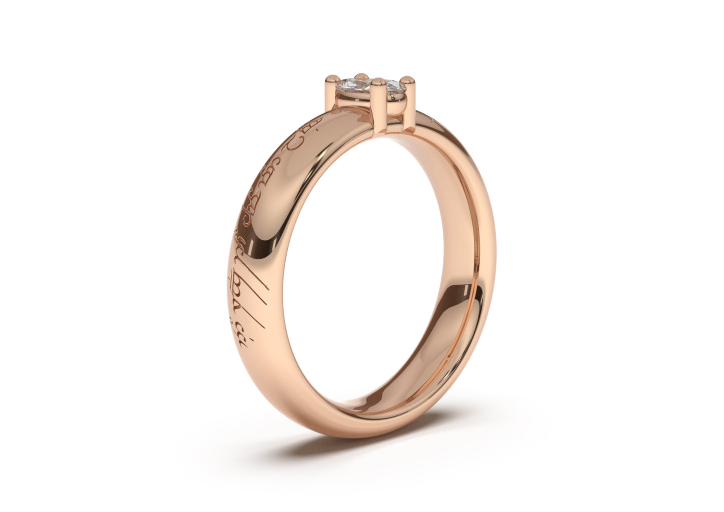 The engraving is often what truly gives a ring its meaning. You can choose your own Elvish (or any other language) engraving for both inside and outside the ring.The Elvish Love Poem fits perfectly on the outside of the ring:One ring to show our love,One ring to bind us,One ring to seal our love,And forever to entwine us.