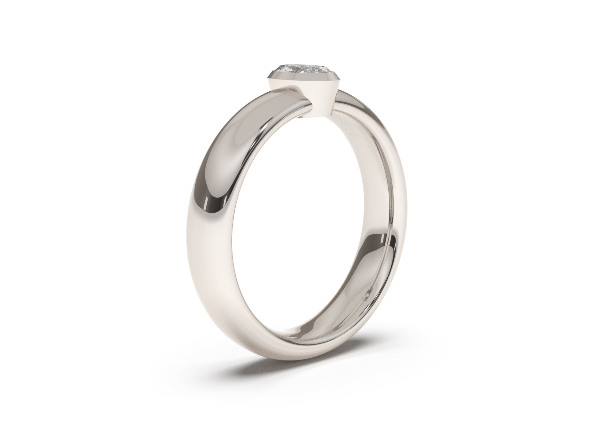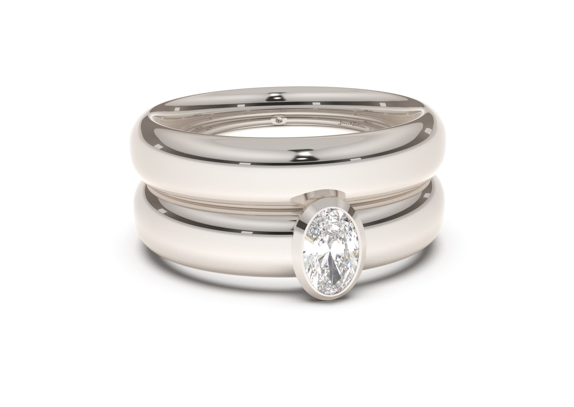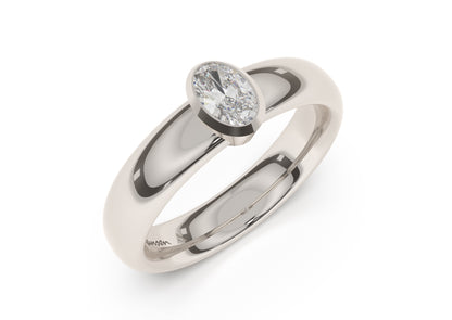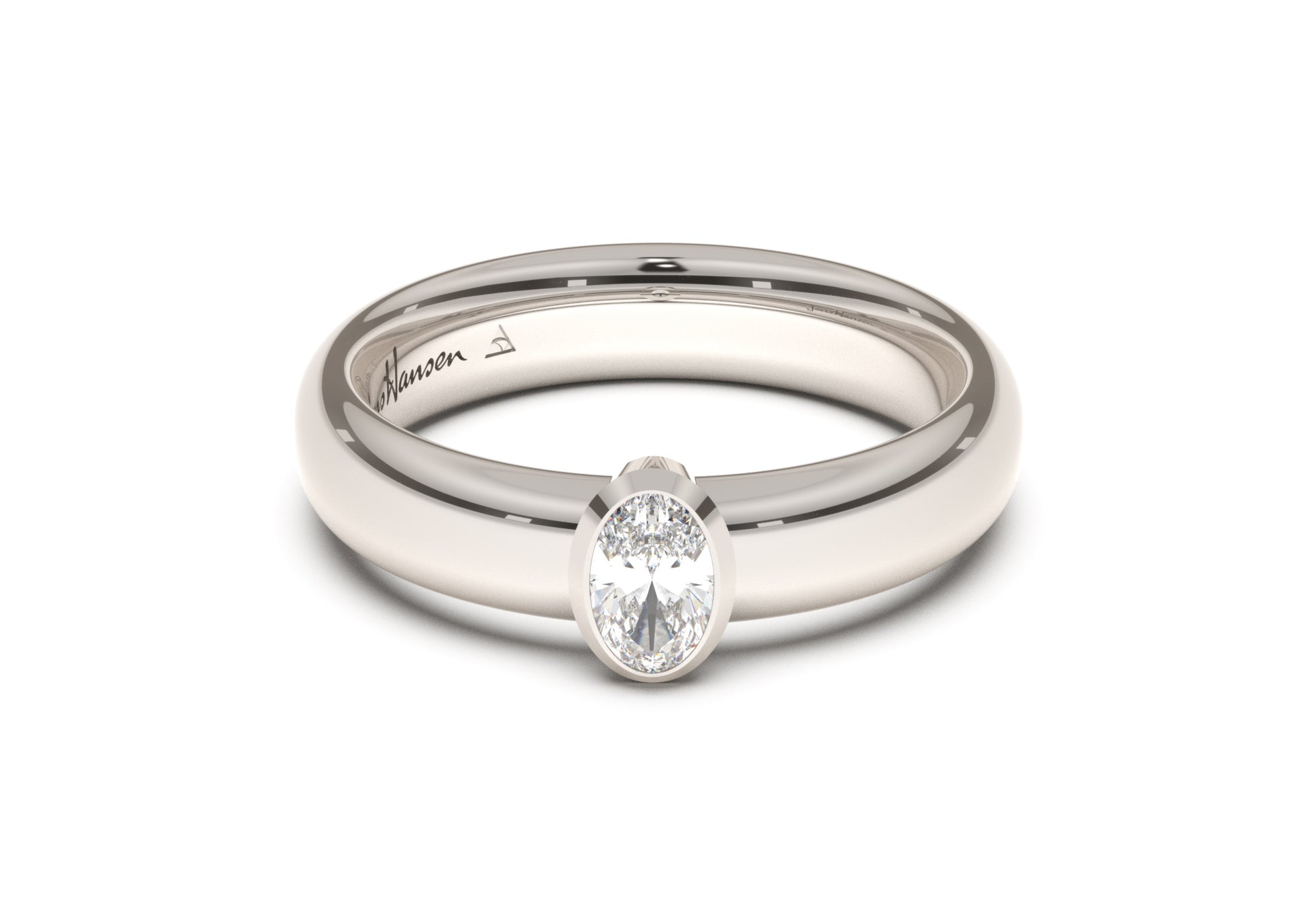 Elegant contemporary styling, fashioned in white gold or platinum, this ring features a tapered bezel setting that showcases the brilliance of the oval diamond.