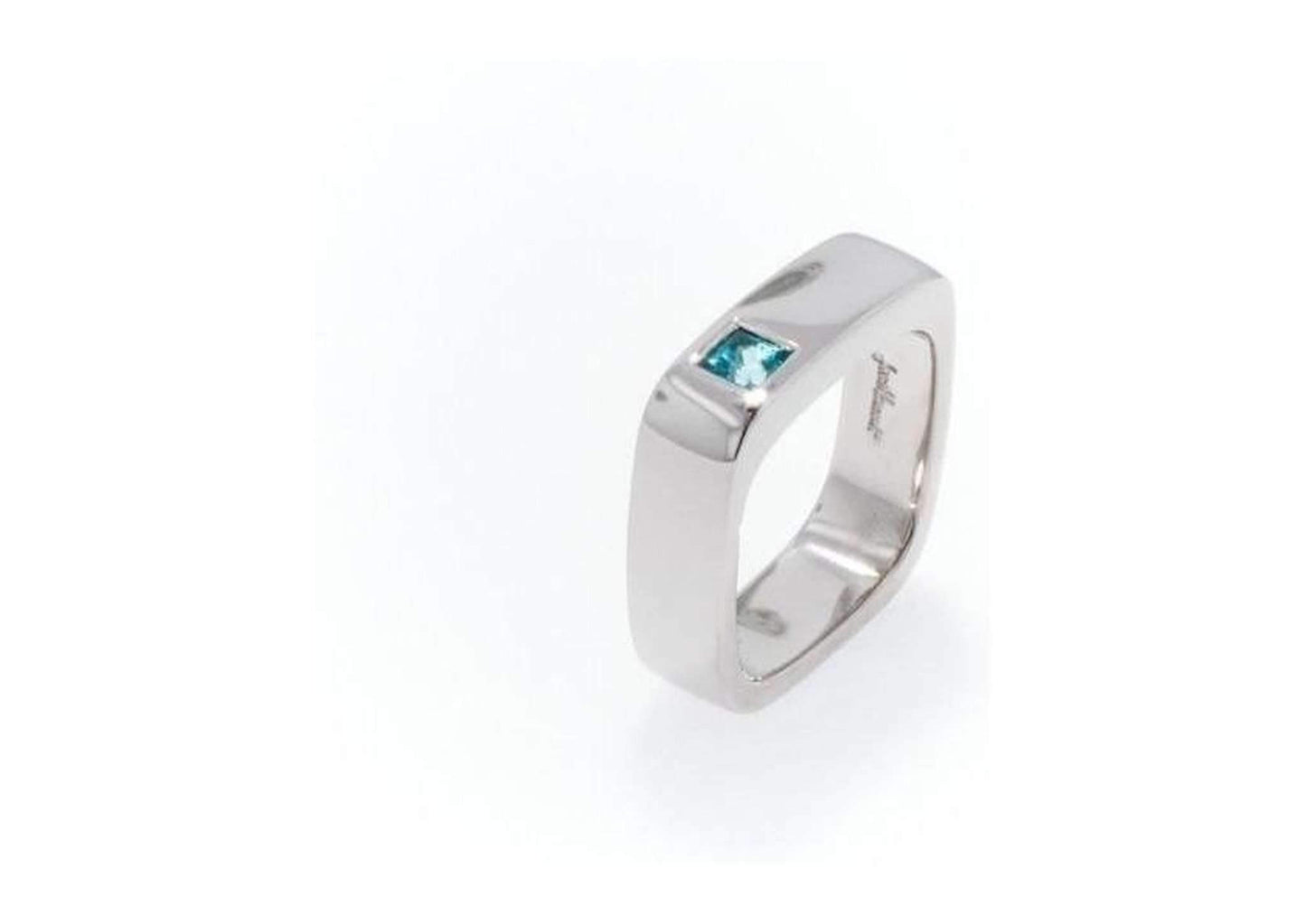 A daring design, this stunning piece takes ring design to another level. This ring has a 7 mm wide band of perfectly polished palladium that is shaped into a gently rounded square. The beautifully blue 4 mm Swiss Topaz is offset to one side, playing with one's preconceived notion of beauty.
