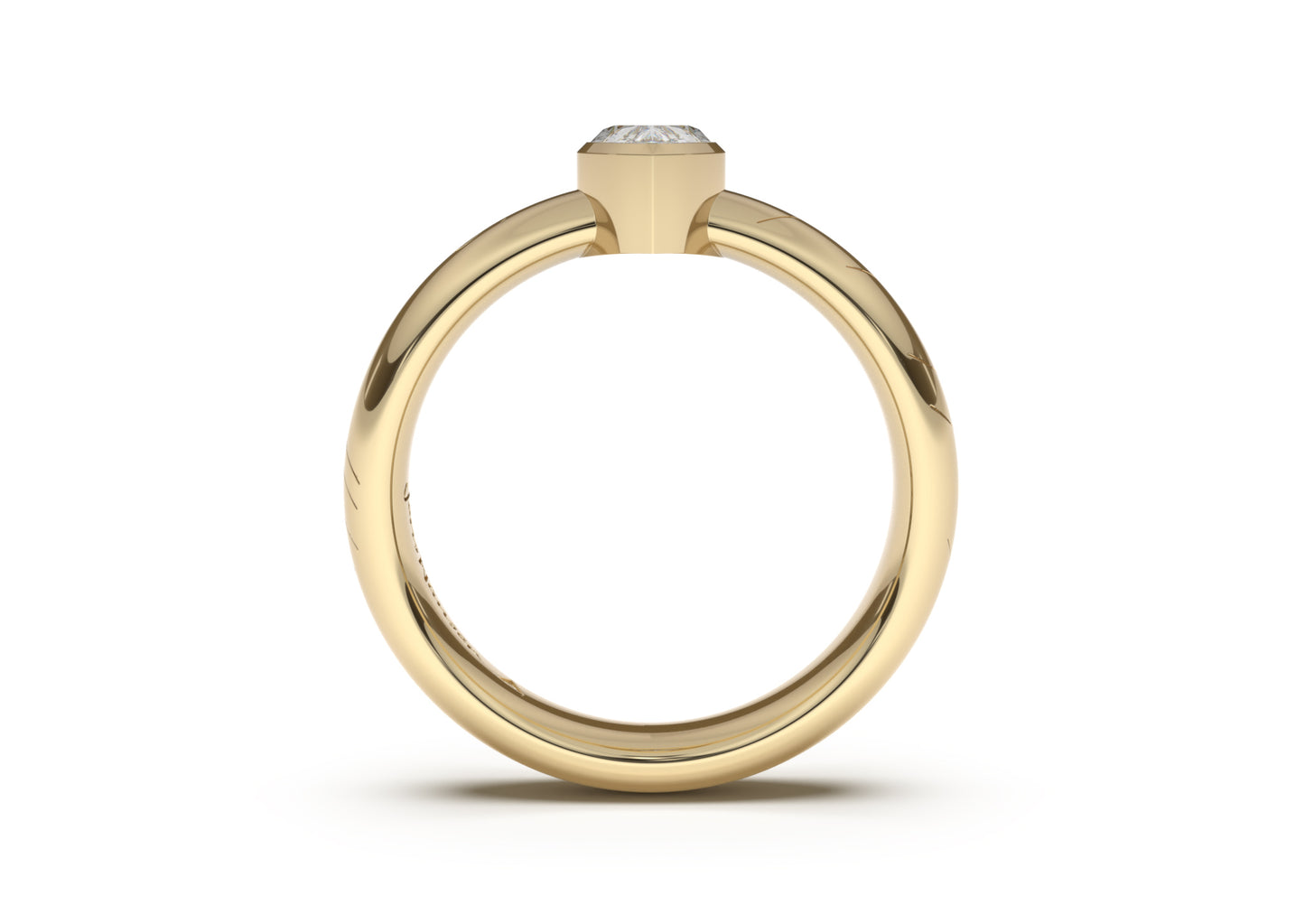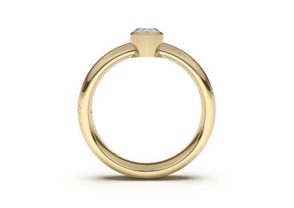 Stunning modern styling, fashioned in yellow gold, this ring features a straight bezel style setting that showcases the brilliance of the pear shaped diamond and provides ideal protection.