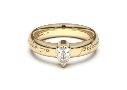 The engraving is often what truly gives a ring its meaning. You can choose your own Elvish (or any other language) engraving for both inside and outside the ring.The Elvish Love Poem fits perfectly on the outside of the ring:One ring to show our love,One ring to bind us,One ring to seal our love,And forever to entwine us.