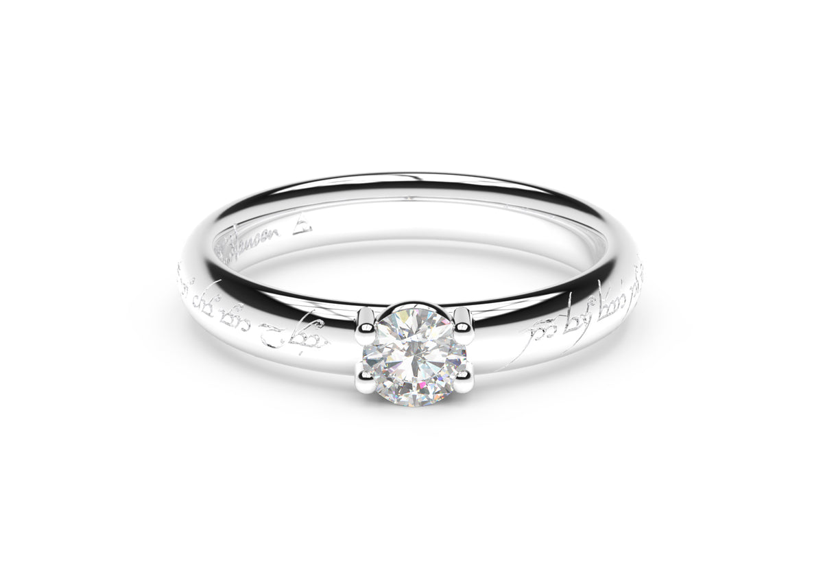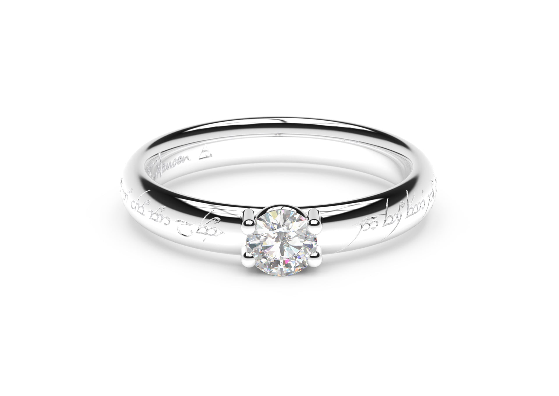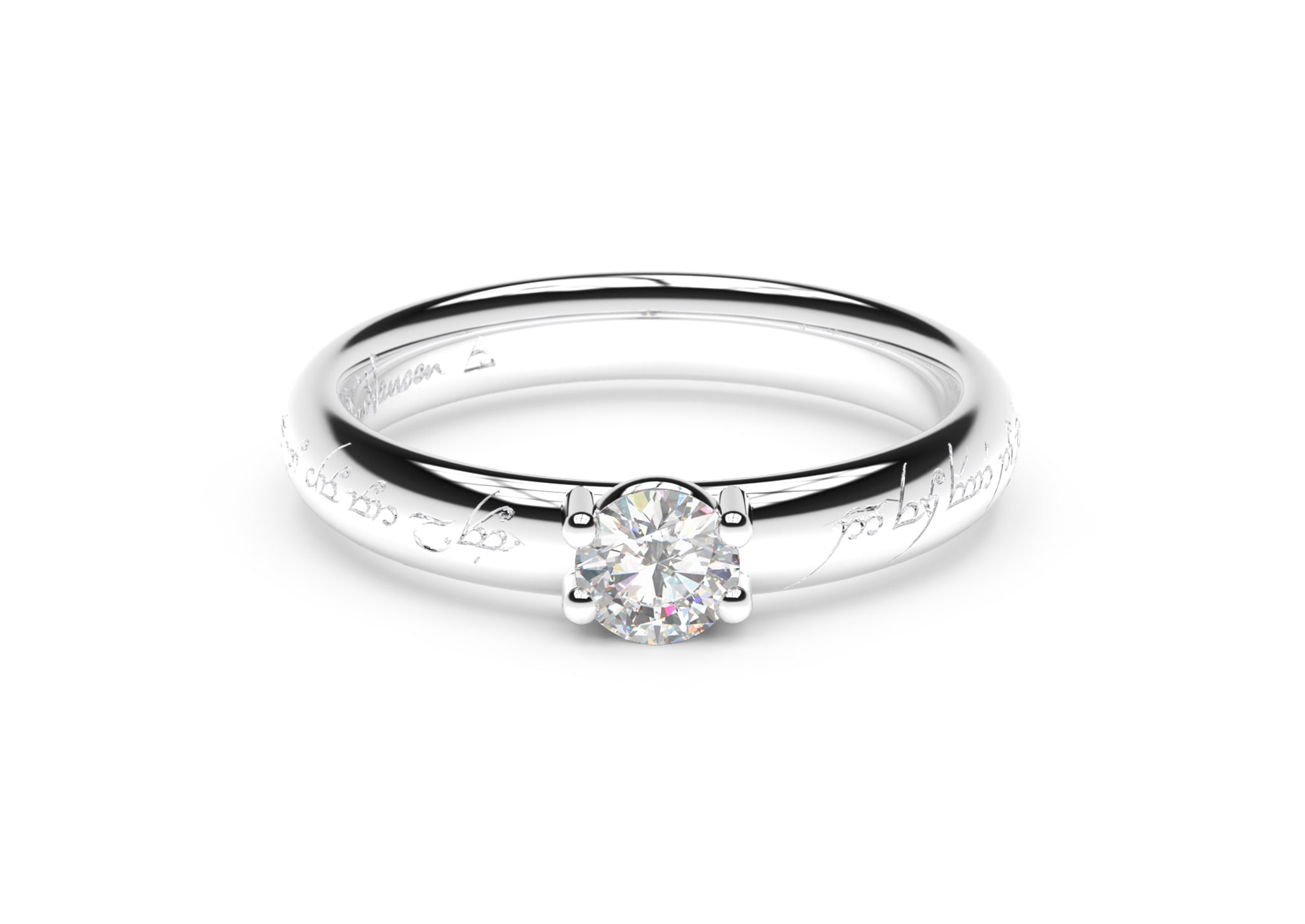 Elegant contemporary styling, fashioned in White metal, this ring features a four prong setting that showcases the brilliance of the diamond. The band has the same unique shape as our Famous replica Ring and is Engraved with our Elvish Love Poem putting this design a step above the ordinary.