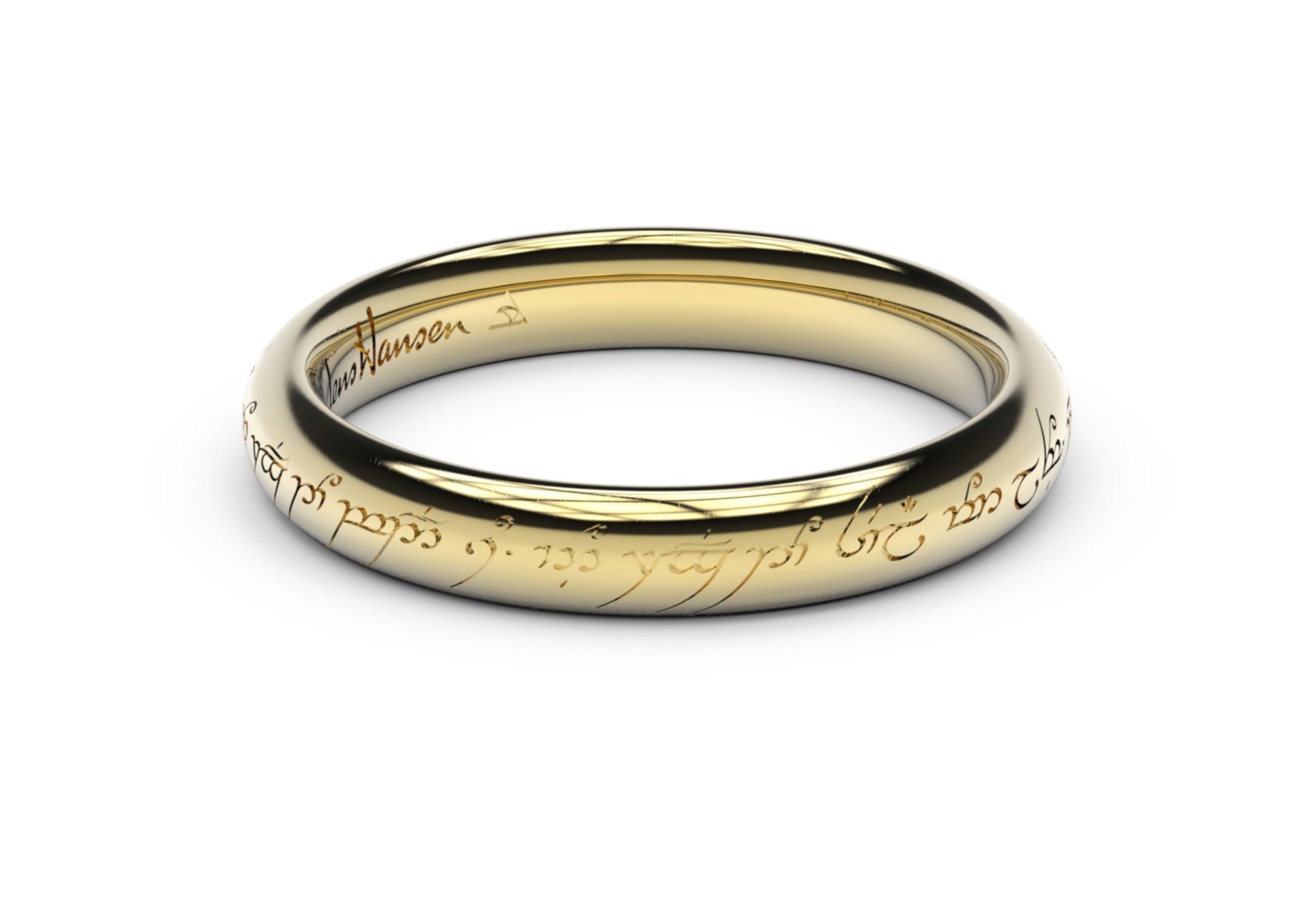 The Jens Hansen Ring that was filmed for The Lord of the Rings™ movies was originally made in 18ct yellow gold. It weighed approximately 17 grams (more than 1/2 oz.), is 2.7mm thick through the band and measures about 7mm tall (just over 1/4 inch) when laid on its side.