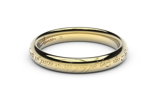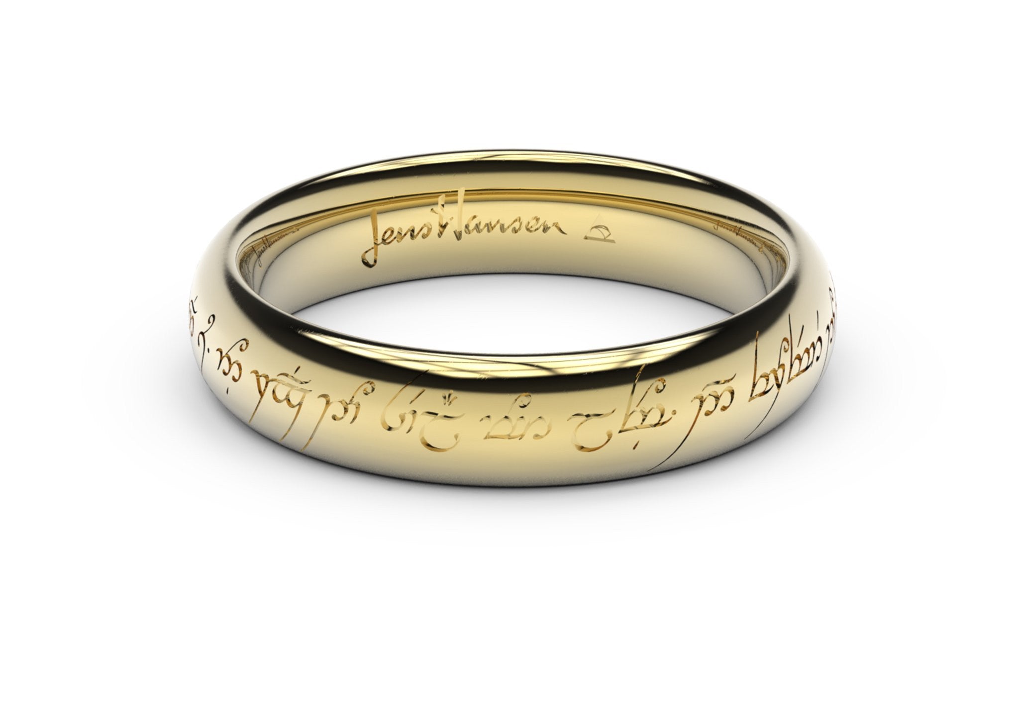 This Elvish Love Ring is a recreation of the “Movie Ring” that played the role of the “One Ring” in the “Lord of the Rings” movie trilogy by Peter Jackson.The design is based on how one of Jens’ sons, Thorkild, described the ring as a child:“Simple, heavy band.”Since the first movie premiered in December 2001, the Movie Ring has been the most recognizable ring in the world.