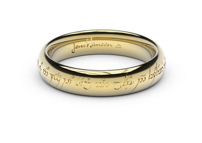 The engraving is often what truly gives a ring its meaning. You can choose your own Elvish (or any other language) engraving for both inside and outside the ring.The Elvish Love Poem fits perfectly on the outside of the ring:One ring to show our love,One ring to bind us,One ring to seal our love,And forever to entwine us.