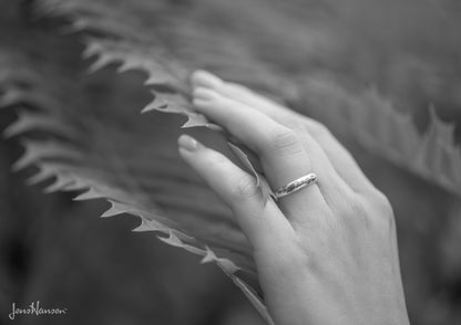 This 'little One' measures just over 5mm wide and is about 2mm thick through the band. Making it a perfect Elvish themed wedding band for the smaller hand.