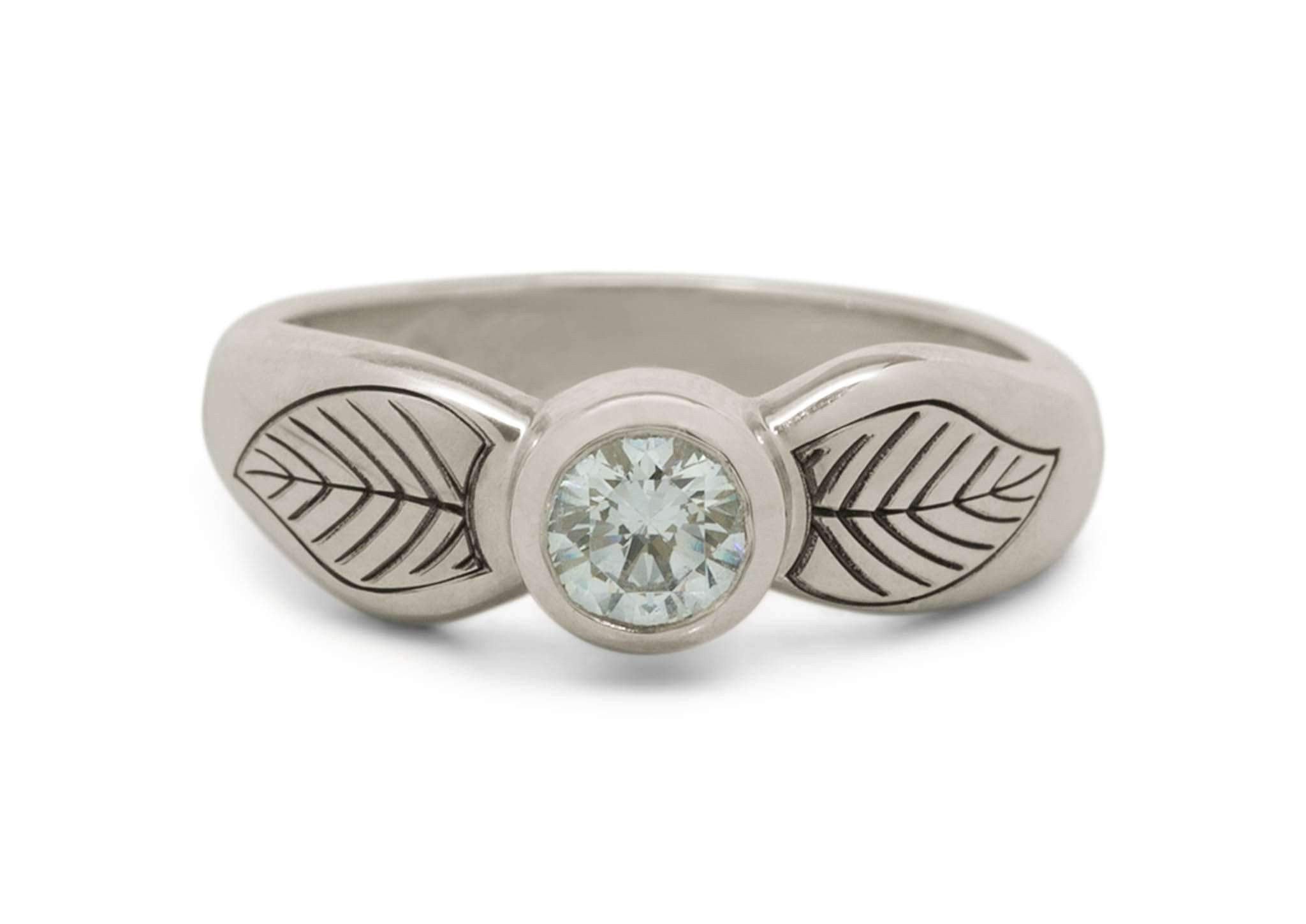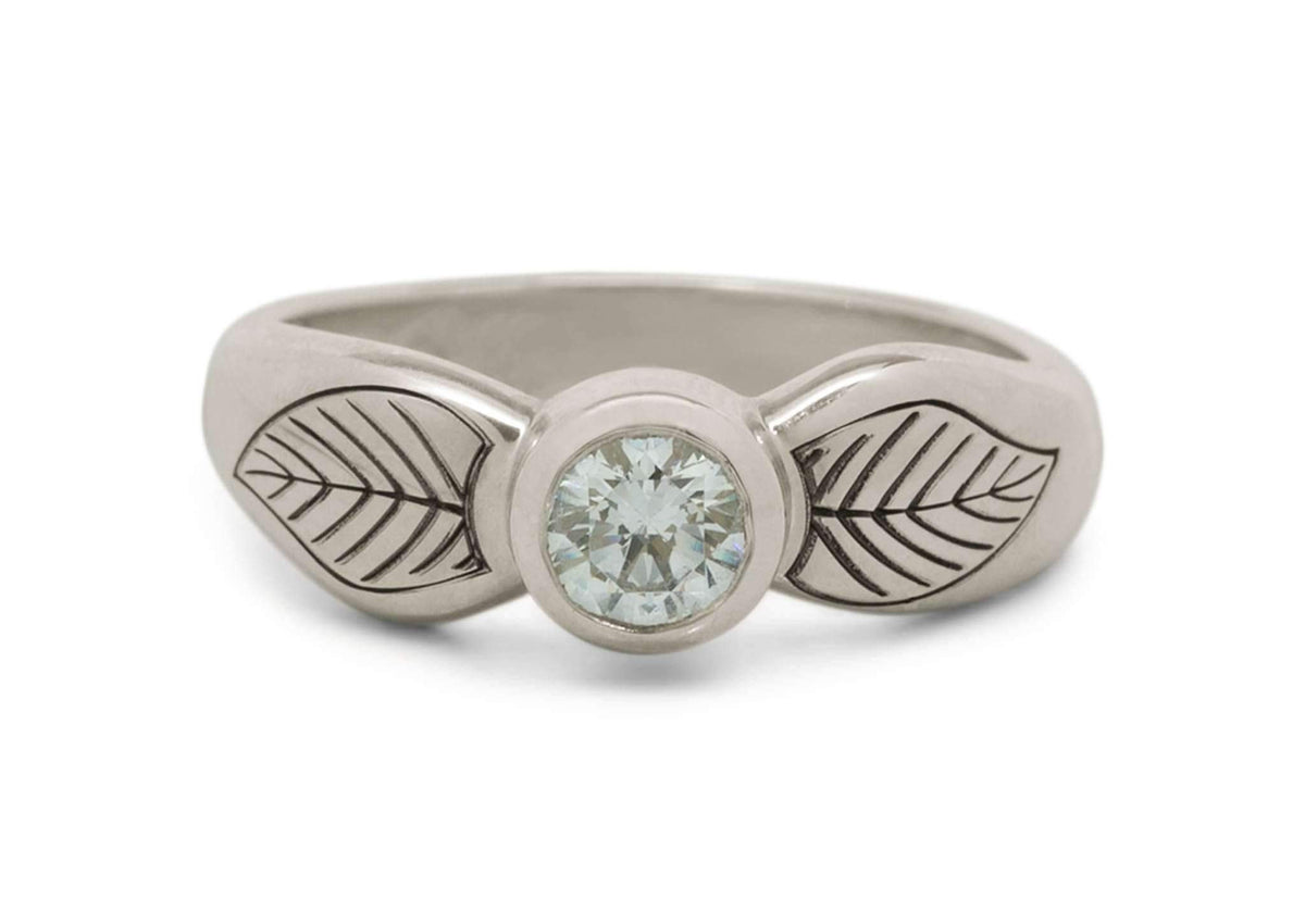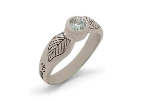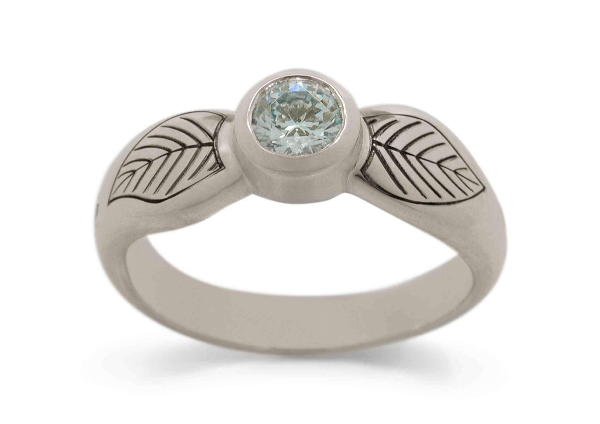 Inspired by all things Elvish, we created this stunning Engagement ring. The ring has a bezel set round stone and it can be engraved with side leaves and a personalised message of your choice, the inside may also be engraved depending on the length of your message.